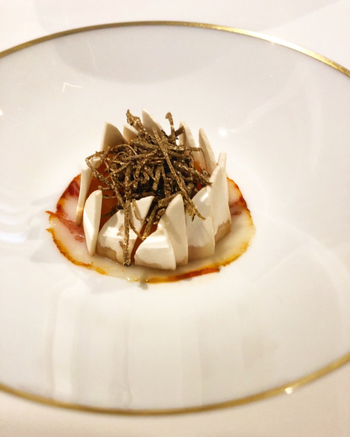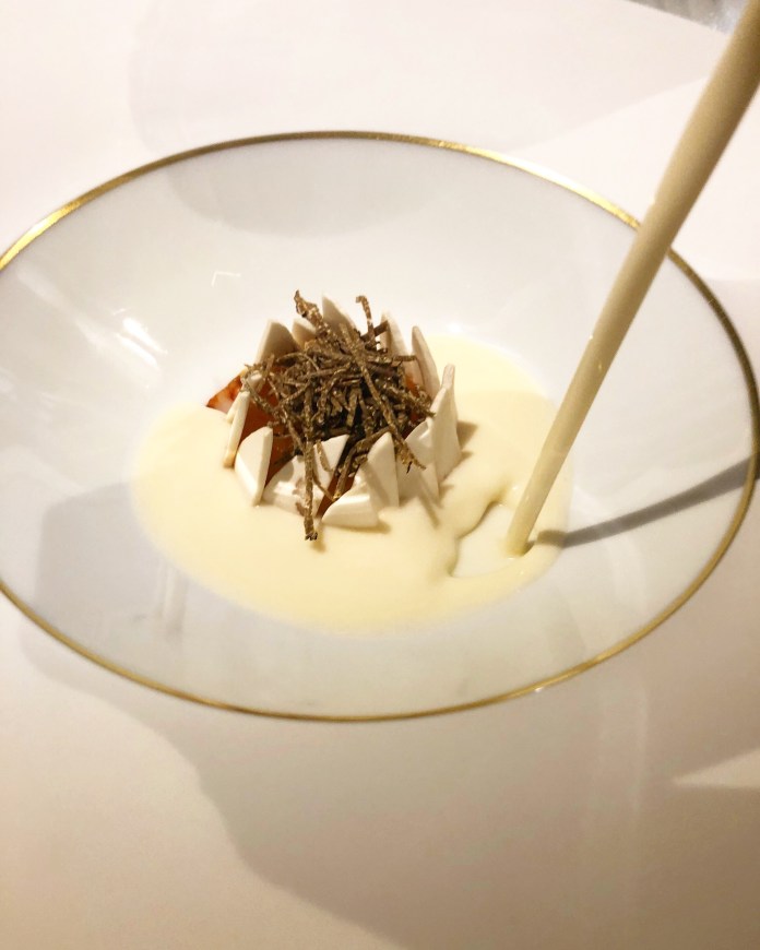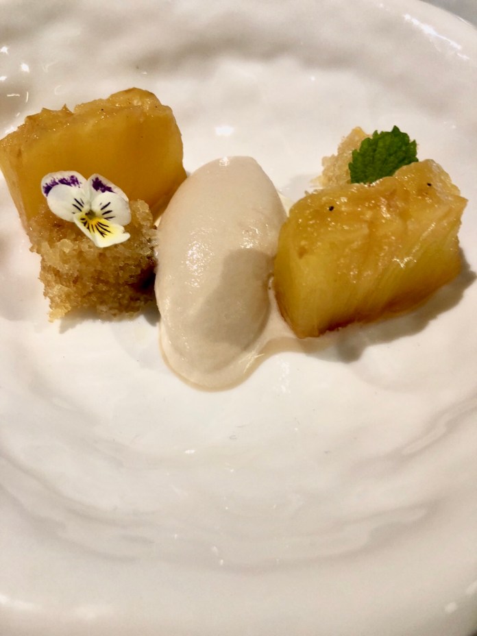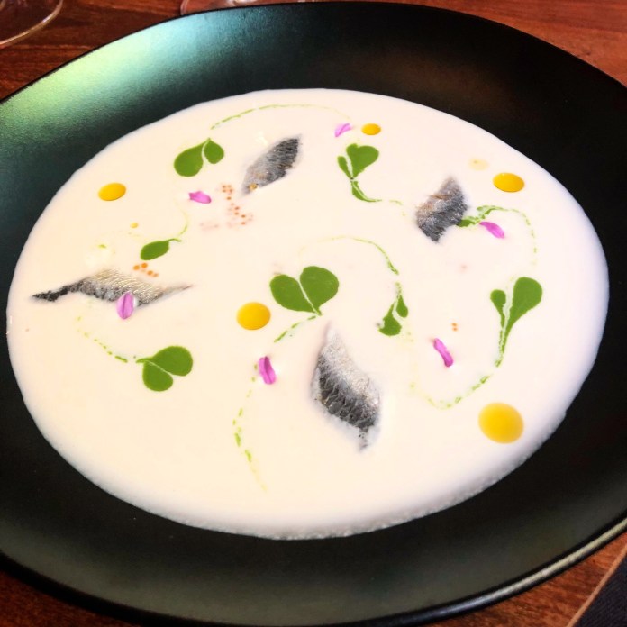 Exactamente como ocurre con el ajo verde que así se llama por ser de pistachos y por dejar de lado la almendra. Queda muy bien así sustituida. El plato es precioso. Una composición de hilos de ajo negro, anguila al Josper, crema de anguila y flor de pensamiento. Todo eso llega en el fondo del plato y en la mesa se recubre con la verde crema. Todos los sabores armonizan cuando se unen y sus contrastes son deliciosos.