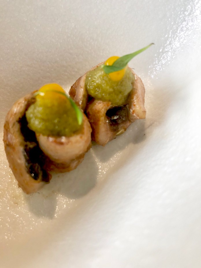 Como segundo aperitivo un asta de ¿venado? (ni idea de zoología) con brioche de morcilla y chorizo de corzo. Excelente el chorizo y muy bueno el sabor de todo pero bastante basto y seco el brioche.