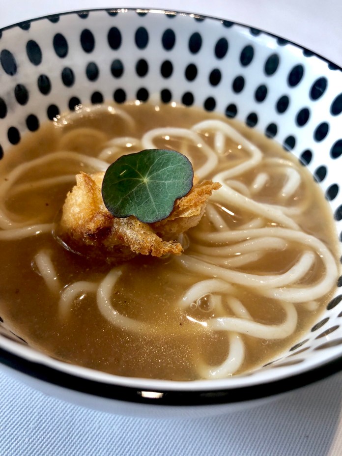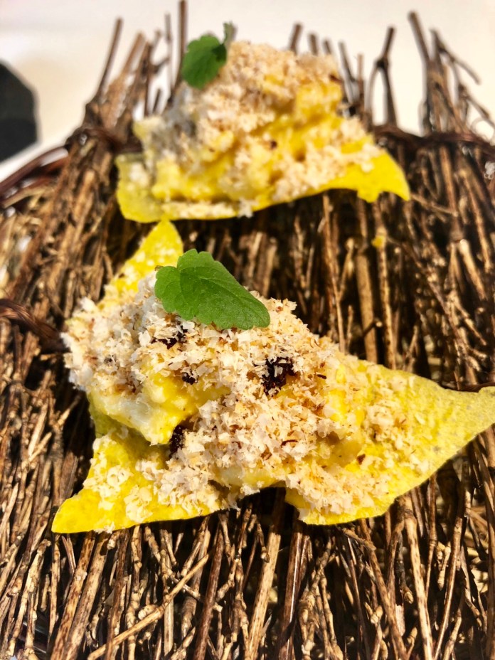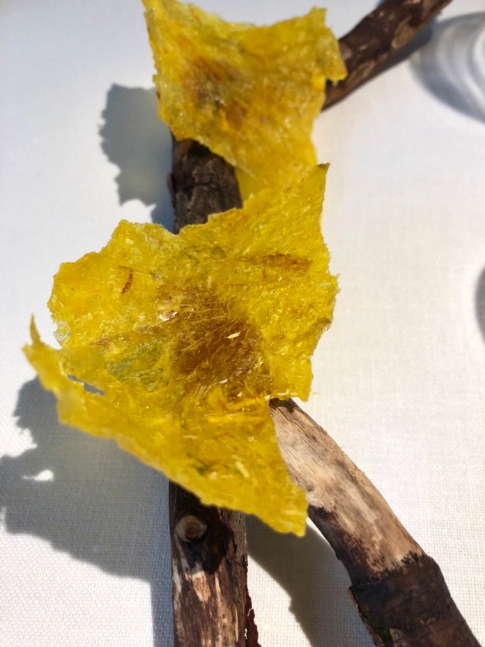 No me gustó un pelo, así que vayamos a la comida en la que hubo hasta cosas memorables. Se empieza con una caja que se desencaja formando un mantelito de madera y exhibiendo un buen morteruelo, esa maravillosa pasta manchega de caza que sabe a puro otoño y mezcla sabiamente muchas carnes (hoy codorniz, liebre, perdiz, etc) con cebolla y especias. Aquí es versión sopa y me ha encantado. Menos contundente, gran sabor no obstante y completamente diferente.