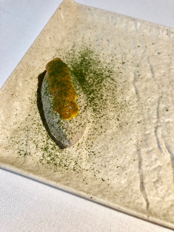 Llevo un rato dándole vueltas a cómo describir lo que sucedió a continuación sin parecer ordinario. Pensaba en algo como caer cuando se está a punto de coronar la cima pero, además de cursi, no me parece adecuado. Quizá fue, como dicen que es…, un gatillazo. Después de casi alcanzar el orgasmo gastronómico, resulta que, de 21 platos en la carta, solo hay tres postres y uno de ellos frutas con helado. Siempre digo que esta es la asignatura pendiente de la cocina española, pero los demás al menos lo intentan. Ignoro si este cocinero sabe hacer postres o es perezoso, pero a las frutas solo se añade un bizcocho y lo que es peor, un chocolate que resulta ser el ya insoportable (por vulgar, por manido) coulant, lo que además de incompetencia demuestra falta de originalidad.
