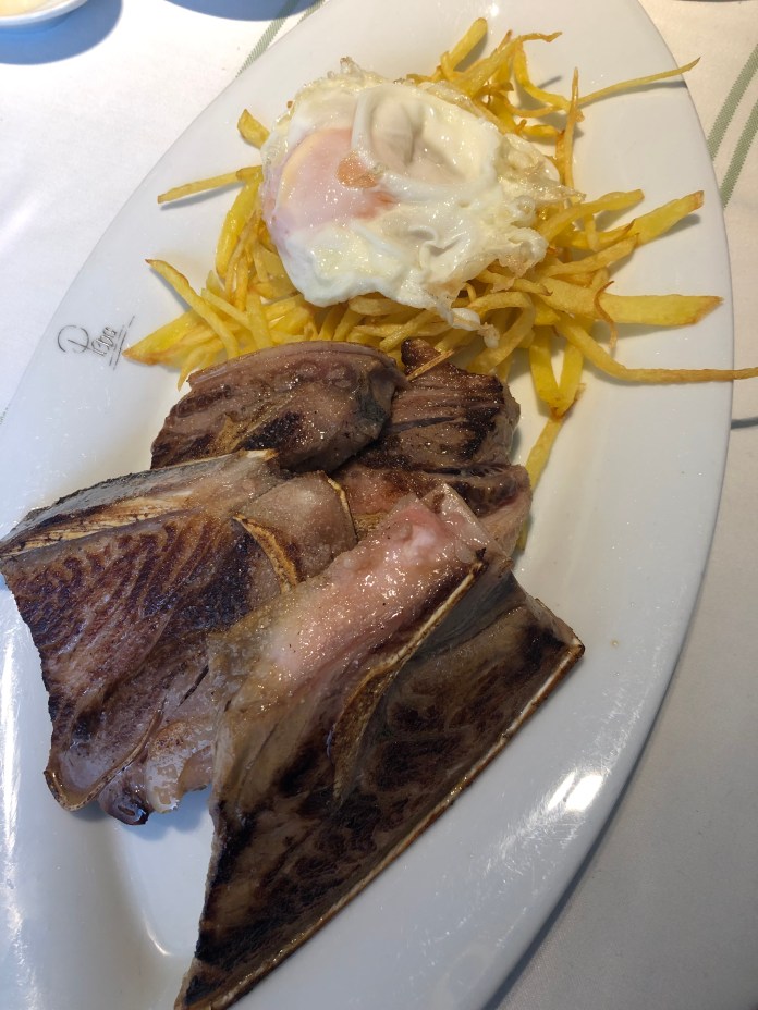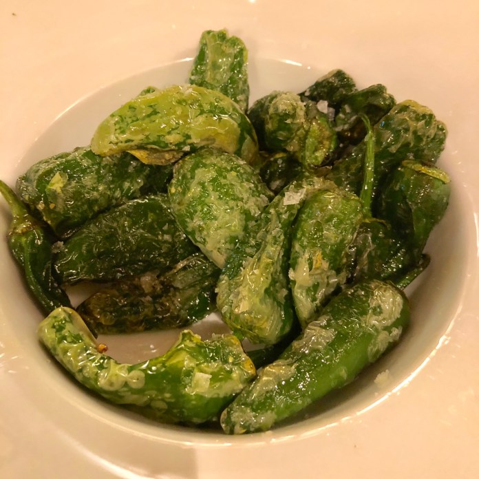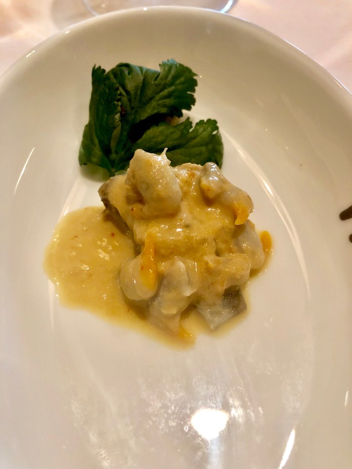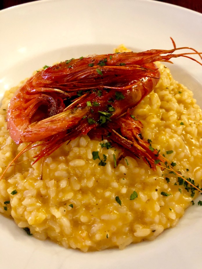 El arroz meloso de carabineros no está, sin embargo, entre lo mejor de la casa aunque parece ser plato muy popular porque lo vi en todas las mesas. Los carabineros son tamaño gamba grande y la cremosidad se la da un estilo risotto que me parece poco adecuado para nuestros arroces marineros. Dicho esto, tiene un sabor intenso con leves toques picantes que mejoraría con menos «cremosidad».