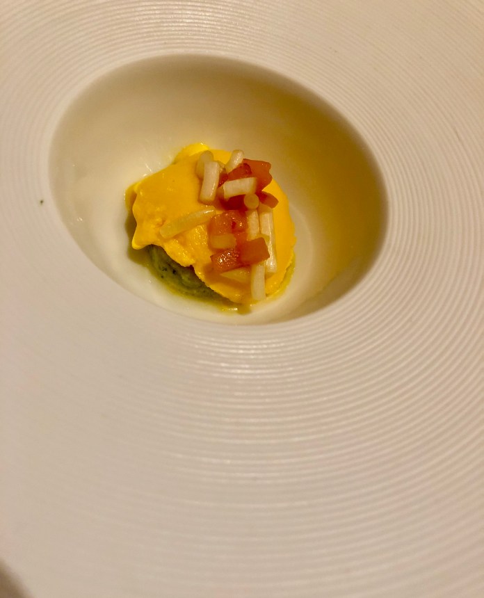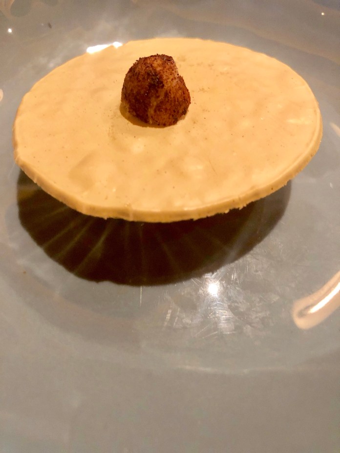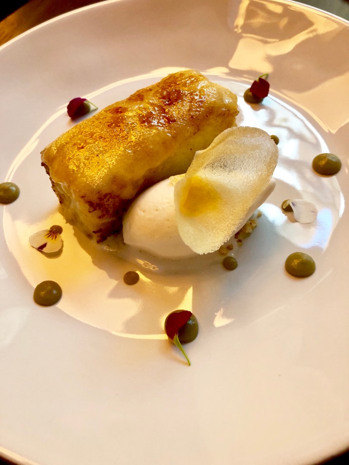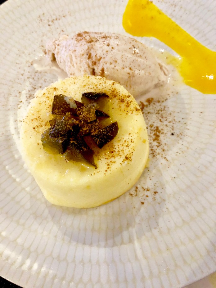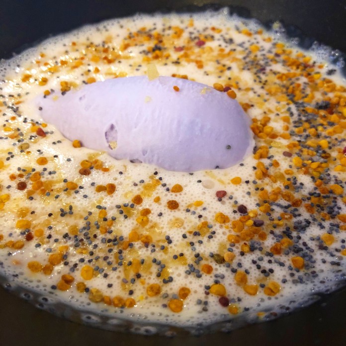 Seguramente lo mejor de todo llega con el postre que nos recomiendan, cremoso de plátano y yogur con su chispa, miel de brezo, polen y helado de violeta. Salvo que el cremoso estaba algo aguado, el resultado, por su originalidad y encanto, es sobresaliente. El dulzor del plátano combina a la perfección con el agrio del yogur, las chispas son peta zetas que hasta estallan ruidosamente y el helado de violeta, magnifico por sí solo, se funde a las mil maravillas con los otros sabores, enriqueciéndolos en grado sumo. Si son dulceros, este postre ya vale la visita.
