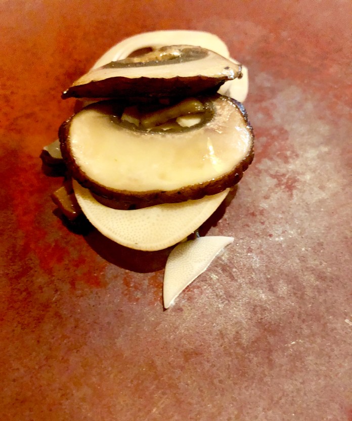 Empezamos con unas tiernísimas y sabrosas alcachofas confitadas. Ya saben de mi devoción por la alcachofa. Estas, terciadas y sedosas, doradas y muy brillantes de excelente aceite, crujientes de granitos de sal gorda, llenaban el paladar de sabores florales.