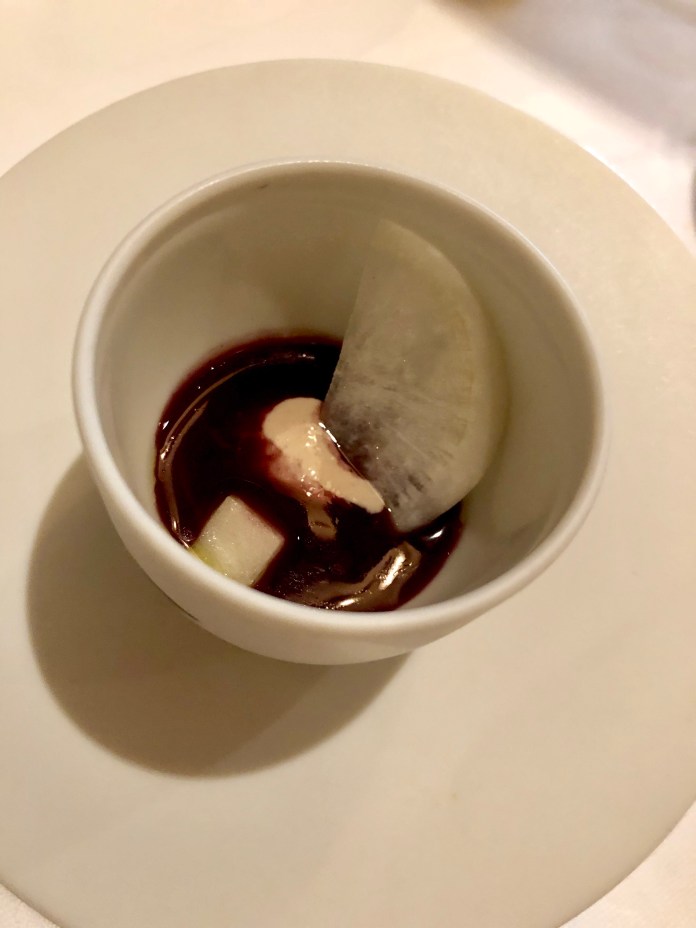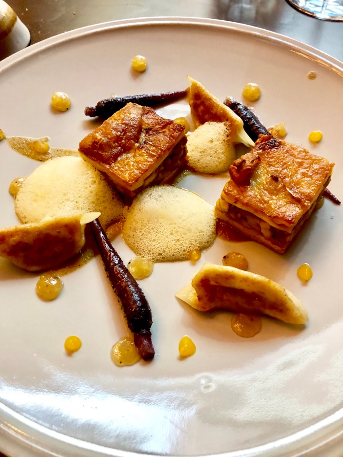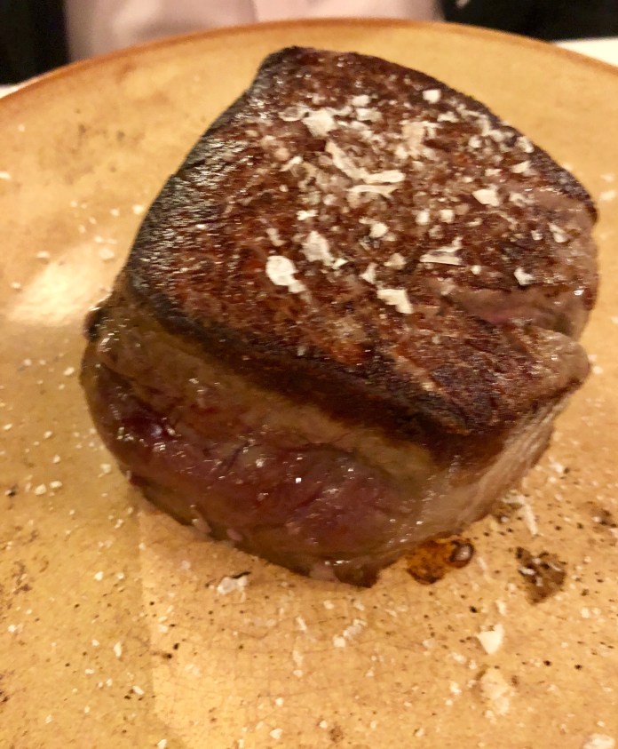 El solomillo de ciervo estaba realmente bueno. Un lomito muy tierno y jugoso con un punto perfecto. Remarcable -algo tan aparentemente obvio- por varias razones. Primero porque estas carnes son duras y no tantas veces se maceran o maduran bien. Segundo, porque ahora todo tiene que estar semicrudo y no todas las carnes -especialmente las aves de caza- lo admiten. El acompañamiento de trigo, calabaza y ajetes, muy bueno y saludable. Gran contrapunto.