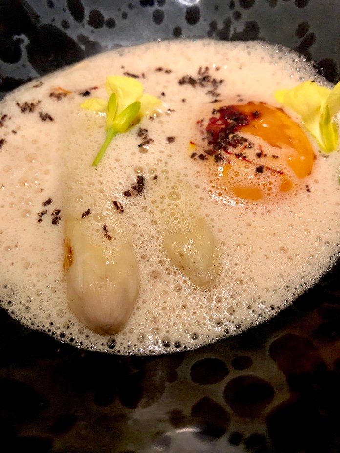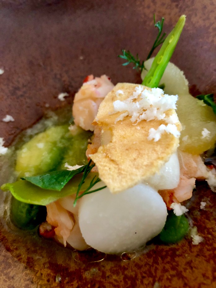 Los guisantes nuevos, jugo de cebolla tostada y Angélica estaban muy buenos porque los guisantes eran excepcionales y se bañaban en un intenso jugo de cebolla, pero eran demasiado simples comparados con el resto de los platos. Quizá un descanso de lo ya paladeado y una preparación para lo que venía, una inmersión profunda en la alta cocina hispano francesa.