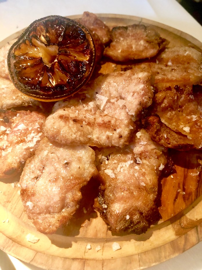 Los aperitivos son unos pequeños bocados, muy elegantes y de intenso sabor, que llegan todos juntos: el bombón de mejillón y pan de semillas es puro sabor, intenso y profundo de escabeche, pero aún está mejor la espléndida versión de la gilda de bonito ahumado y chiles porque es un poderoso bombón líquido con el vinagre y la guindilla que estalla en la boca.