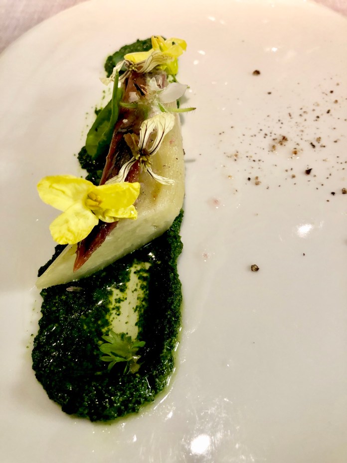 Berenjena a la brasa, anchoa y flores de primavera es una suave y tierna berenjena japonesa con toques ahumados que aligera una muy buena anchoa. Tiene además un sabroso pesto de hierbas anisadas y un buen toque de aceite de café.