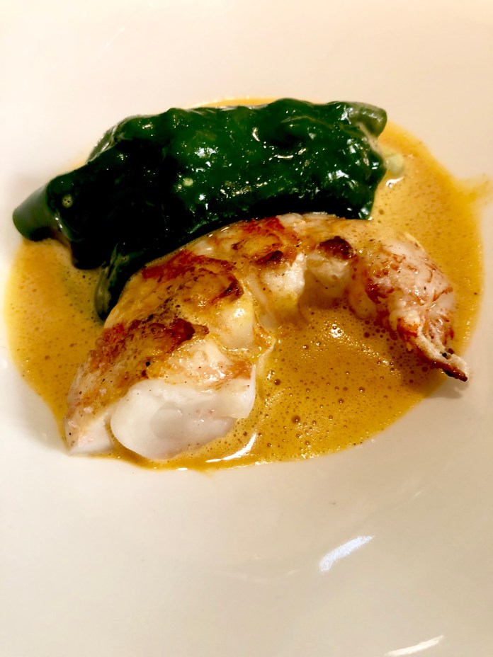 Y es que las habas tiernas, meloso de langosta y pil pil de sus vainas tienen una salsa de langosta y mantequilla muy francesa. Se acompaña de unas delicadas habas a la crema. Me encantan ambas preparaciones pero mejor por separado ya que tantas cremosidades juntas me han resultado algo empalagosas. Sin mezclar son ambas una delicia, como la langosta asada al josper y de punto impecable.