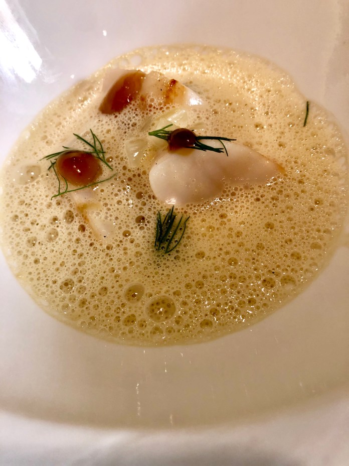 Las vieiras asadas con jugo de hinojo es también un plato muy elegante y afrancesado aunque solo fuera por el empleo del hinojo. Además, la muselina espumosa sabe a crema y mantequilla y esconde algo de eneldo fresco y trozos de hinojo crudo. Me ha encantado aunque las vieiras quedan un poco escondidas.