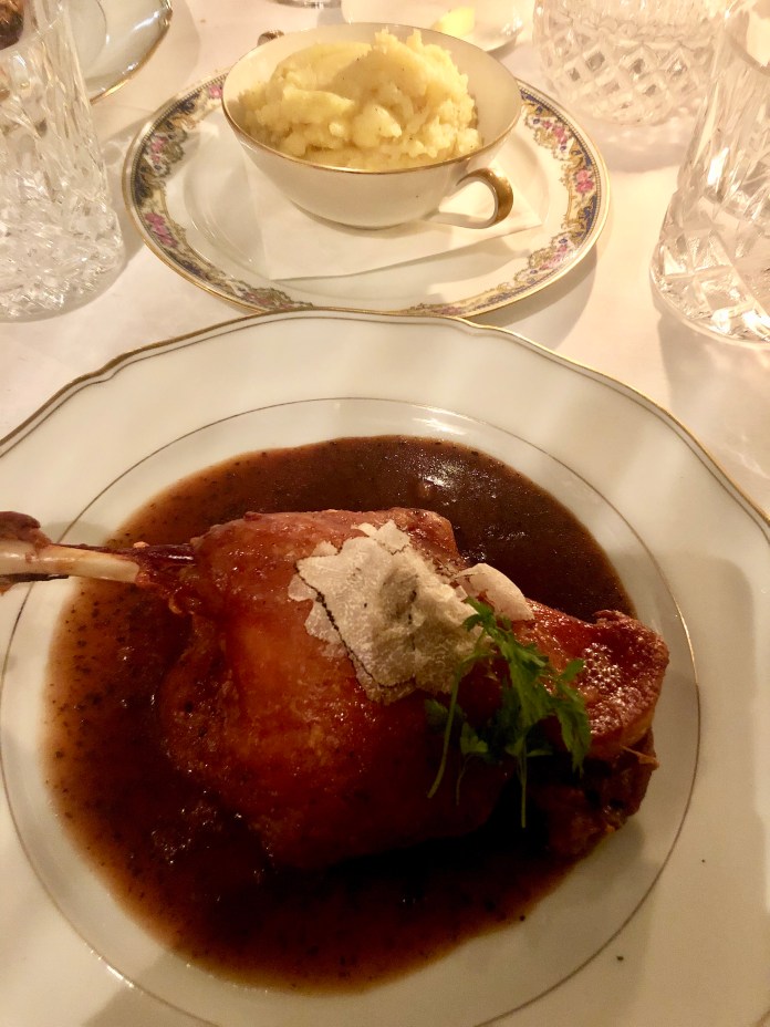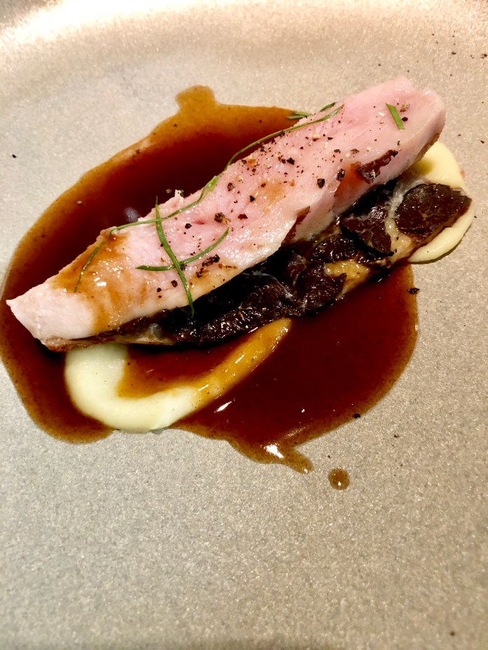 Suprema de pintada trufada y jugo de levístico. Me encantan las aves y dentro de ellas, aprecio mucho la suavidad y dulzura de la pintada. En esta preparación se coloca la trufa entre la piel y la carne y se rocía con una salsa reducida y glaseada con un toque dulce del levístico. Muy elegante y clásico.