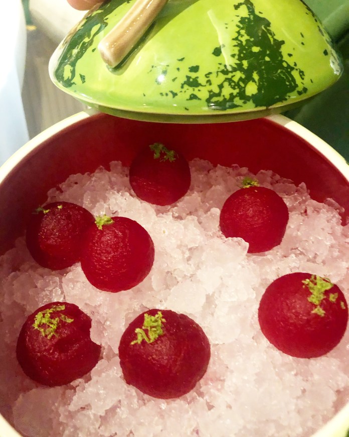 Para refrescar en este punto, un nuevo intermedio, la sandía cítrica, bolitas de sandía que gracias a la técnica de la osmotización se convierten en un cítrico.