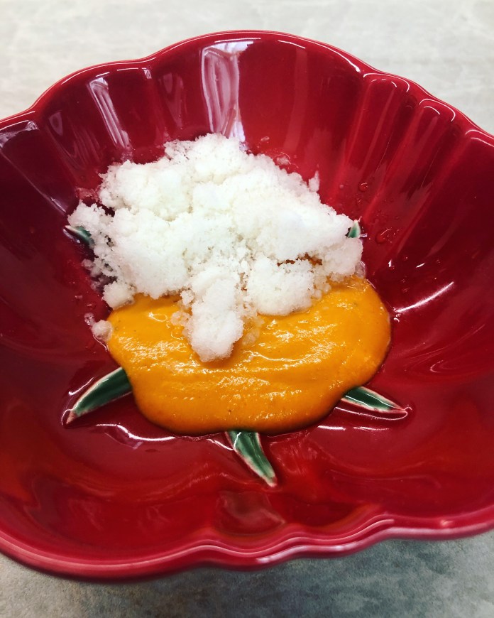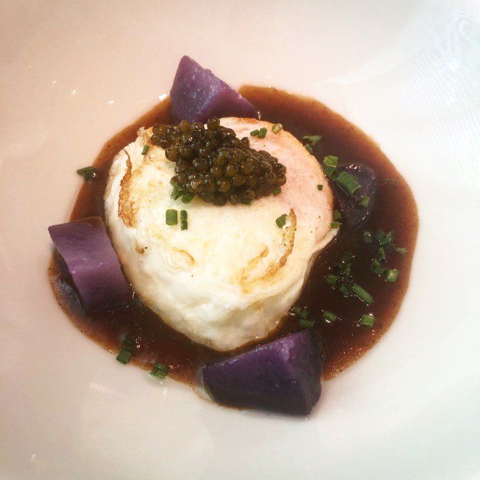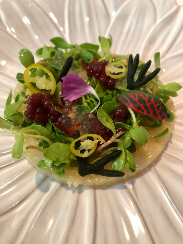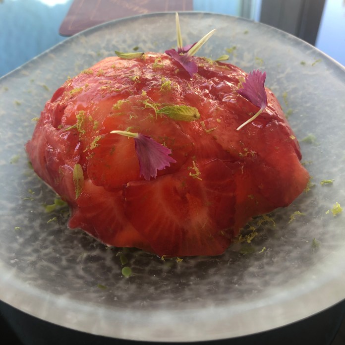 No les voy a contar la puesta en escena de los aperitivos porque es una gran sorpresa, puro camino iniciático, que nos lleva por cinco lugares. Lo que sí puedo contar es que son ocho y van desde un perfecto sorbete de Bloody Mary hasta un granizado de tomate y kimchi -que es una actualización del salmorejo a base de granizado de agua de tomate y crema de tomate y kimchi– pasando por un taco de sésamo y miso de garbanzos que es un cristal dulce y crujiente que esconde foie helado.