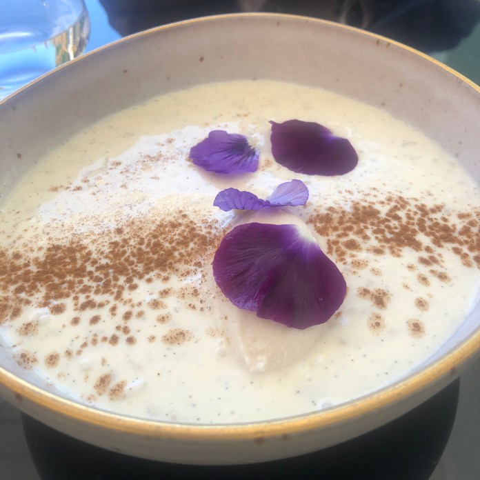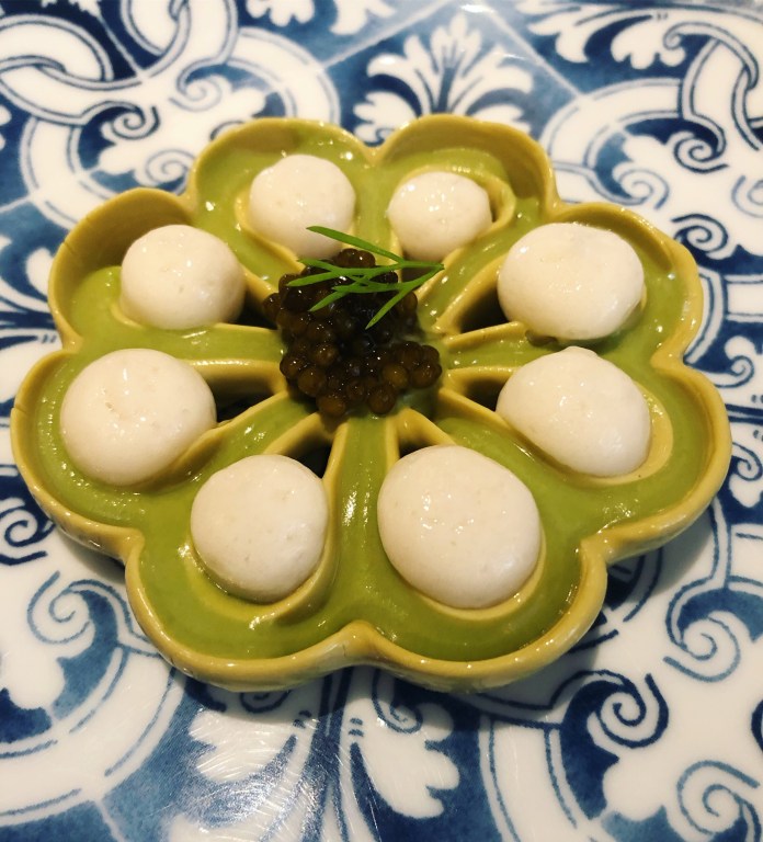 Comienza el menú con flor de pistacho con gazpachuelo de aceituna, espuma de cerveza y caviar. Ha sido un placer reencontrarme con este plato porque una de las grandes creaciones de Sandoval fue el caviar con crema de pistachos y espuma de cerveza negra. Esta receta lo recrea y, al mismo tiempo, da prueba de su evolución, porque lo perfecciona y embellece. Adriá mezclaba caviar con avellanas y hacerlo con pistachos no desmerece nada esa audacia. Los sabores son deliciosos y perfectamente equilibrados, pero la belleza del plato los engrandece.