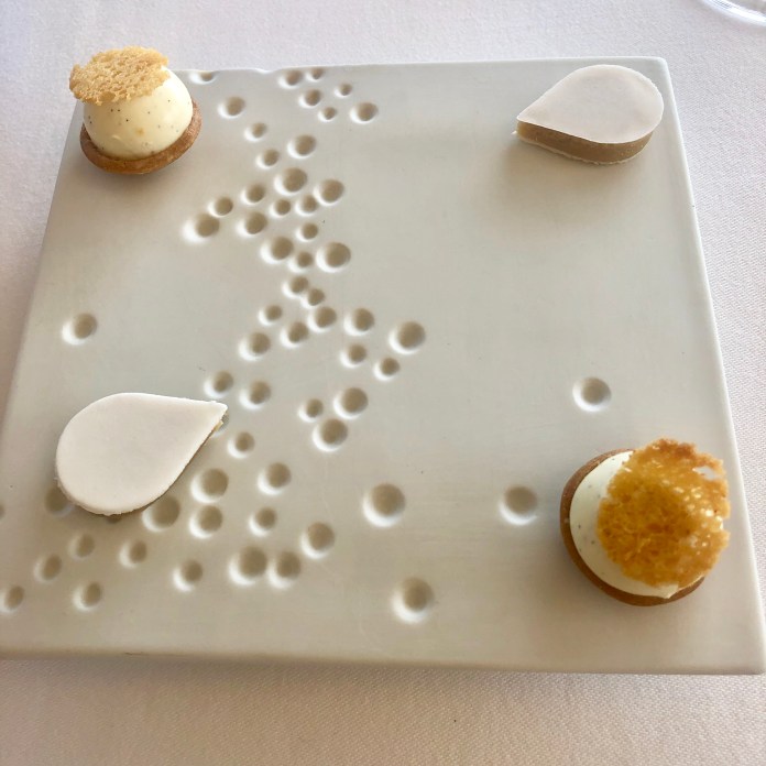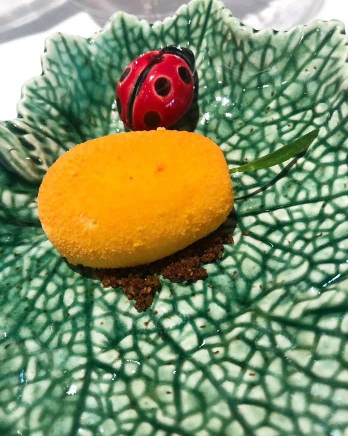 No les voy a contar la puesta en escena de los postres para que les sorprenda su magia, pero sí de la calidad de estos. Son un floral helado de lavanda con un poco de chocolate salado y crujiente de miel, un belllo y espectacular kumquat al Grand Marnier que es un sofisticado y perfecto trampantojo hecho de mousse de naranja y relleno con candy al Grand Marnier.