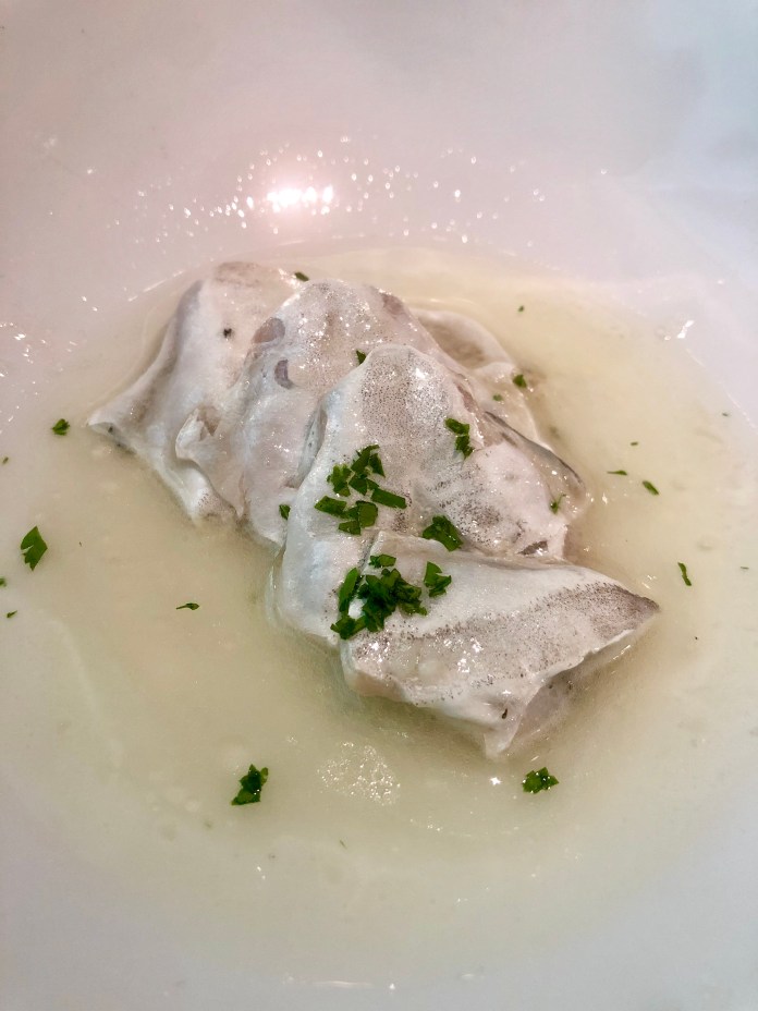 Y faltan sorpresas porque inesperado es, tan al final, un guiso de perrechicos, la delicada y diminuta seta de primavera. La razón es que se presenta con una sabrosa salsa de manitas, pedazos de papada de ibérico y yema curada. Un pedazo de guiso que mejora a los mismísimos perrechicos y quizá la mejor receta que he probado con ellos.