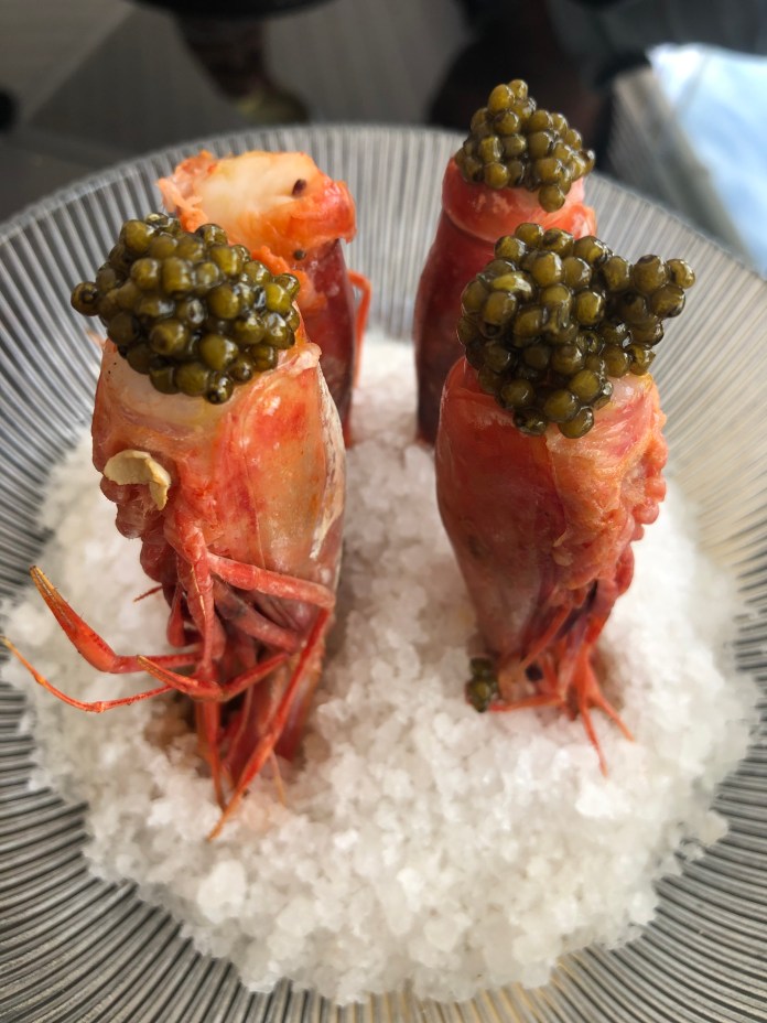 Mario hace grandes cosas con mi marisco favorito, el carabinero. Este invierno los preparaba a la parrilla y con esencia de sus cabezas, pero ya es primavera y para este ligero menú los convierte en salpicón, con un tradicional huevo cocido, pero con la intensidad original de las flores y las verduras fermentadas, una de sus técnicas fetiche en la cual es maestro consumado.