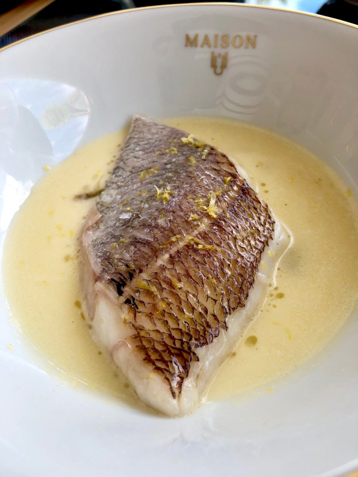 No está nada mal como técnica, pero la que me dejó boquiabierto fue la del bocadillo de salmonete porque el continente, lo que sería el pan, es piel crujiente de salmonete retirada y tratada de variadas formas. En el interior, un suculento escabeche (otra de sus grandes señas de identidad madrileña) de salmonete. Para «mojar» el bocadillo, una mayonesa diferente y una potente crema de sus interiores con toques de avellana. Um plato para abrir los ojos como tales.
