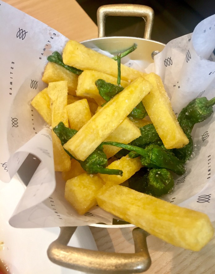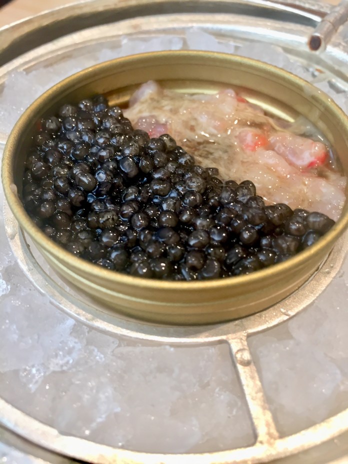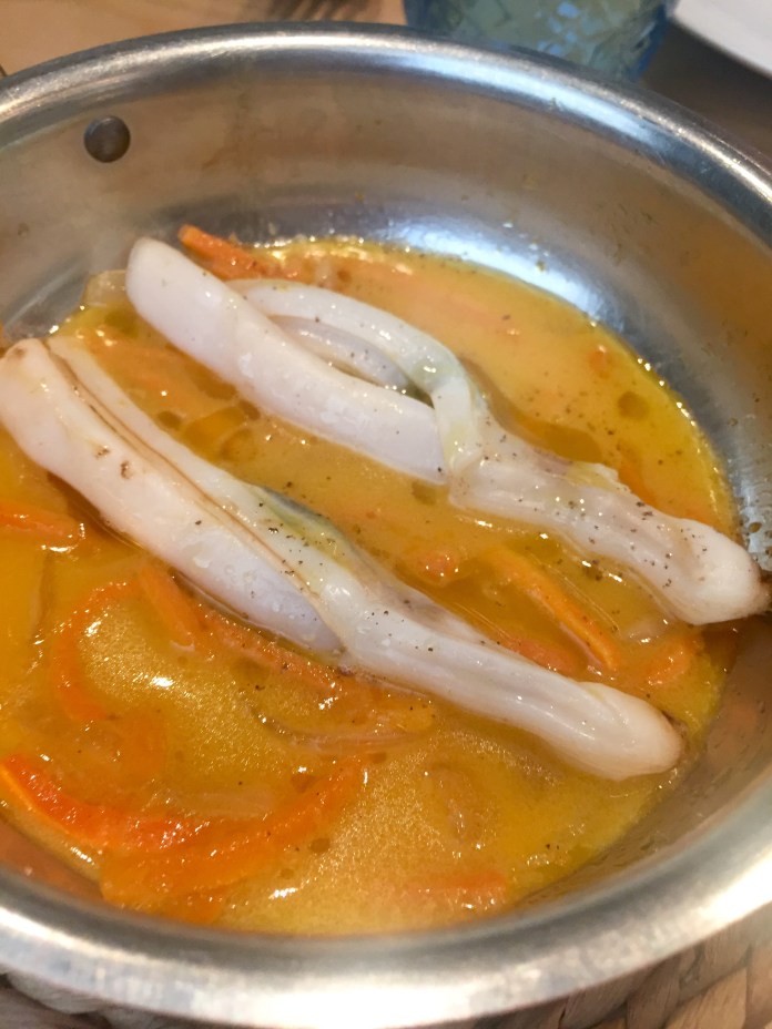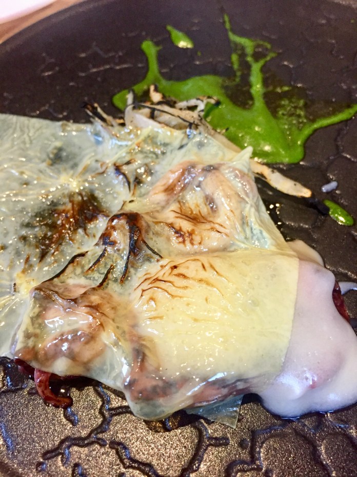 Hemos empezado con un delicioso cangrejo de Dover que se sirve desmenuzado y con pepino encurtido, puntos de mayonesa, crema de aguacate y una punzante salsa de marisco -intuyo que de cangrejo– picante.