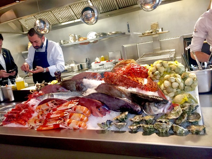 Hay bastantes pescados, pero creo que la justa fama de la casa se halla en las carnes, especialmente las asadas, que son las que se sirven en esos carros que parecen tronos. Y de las carnes inglesas, ninguna como el roast beef. Este es de costilla de vaca escocesa con treinta días de maduración y está tierno y muy suave. La carne se mantiene rosada y muy jugosa, en un punto perfecto. Se acompaña de una buena salsa de rábano picante, tan intensa que si se abusa de ella inunda hasta la nariz, y un esponjoso pudding de Yorkshire para embadurnarlo con la salsa; algo de col cocida salteada en mantequilla -rarezas inglesas- y unas espléndidas patatas como aquí se hacen, primero cocidas y después acabadas al horno con mantequilla. Resultado: interior blando y harinoso y exterior dorado y crujiente. Espléndidas. Y más con la salsa de la carne, de una untuosidad y profundidad enormes.