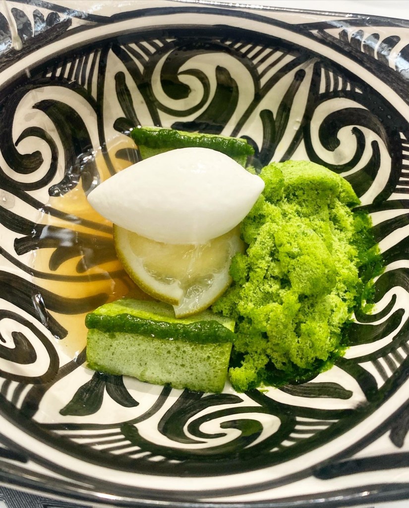 Otro gran pescado es una estupenda lubina con salsa americana de tinta, una gran obra de Mario está salsa y que ya conocíamos de las angulas del invierno, lo mismo que el helado de anguila del salmonete. Es un acierto darles otro aire con nuevas mezclas porque, siendo lo mismo, es también completamente diferente.