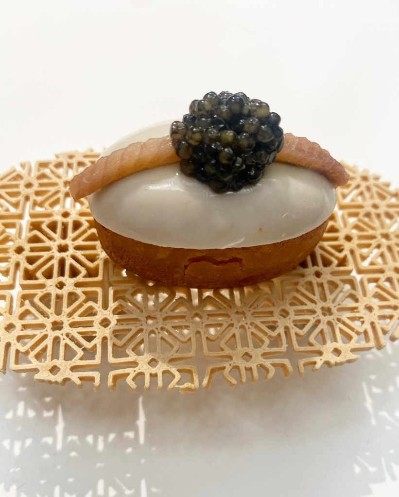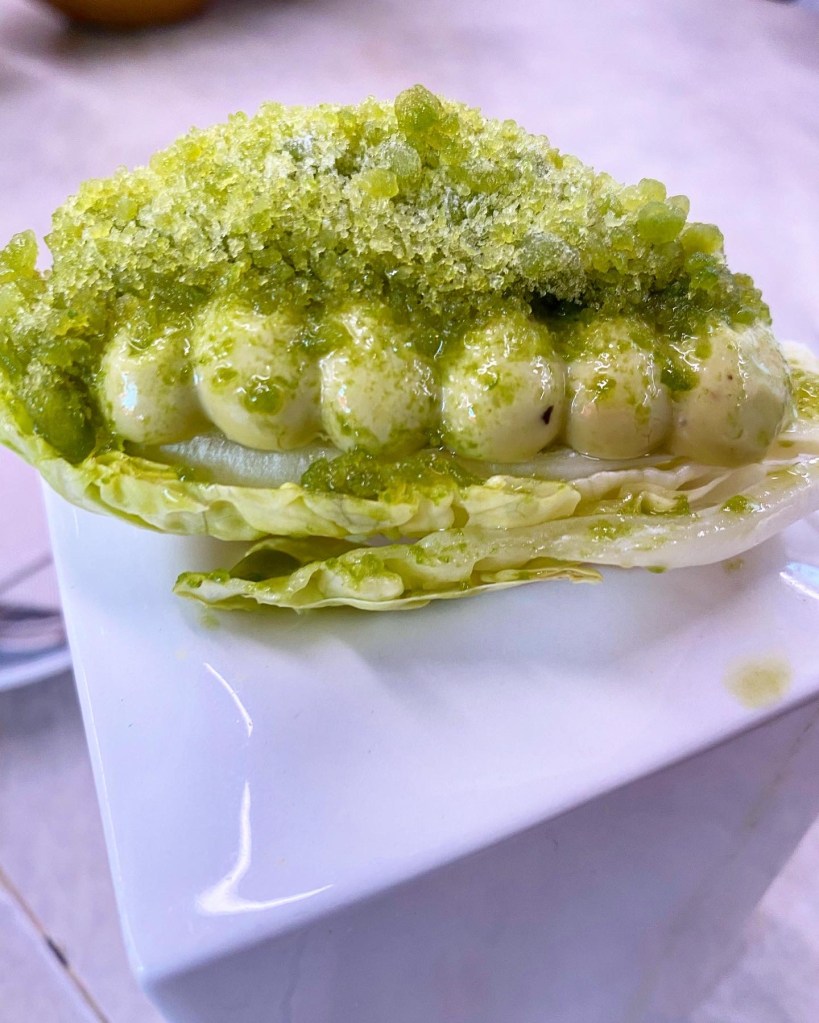 Tras los numerosos aperitivos, el menú EÑE empieza con un clásico revisitado, la bella y muy sabrosa flor de pistacho con gazpachuelo de aceituna, espuma de cerveza y caviar, una creación única del gran chef.