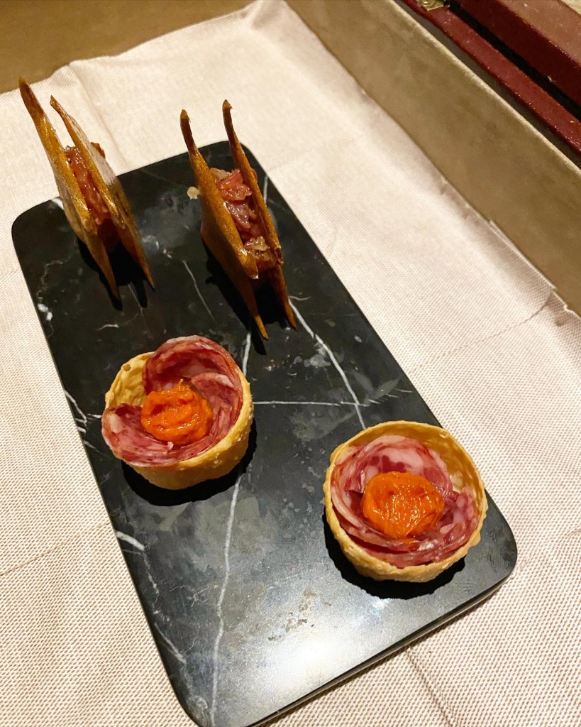 Primero se desciende al recogido y umbroso bar donde el cóctel de la casa se acompaña de un espléndido sorbete de Bloody Mary y un dulce y crujiente taco de miso de garbanzo y foie.