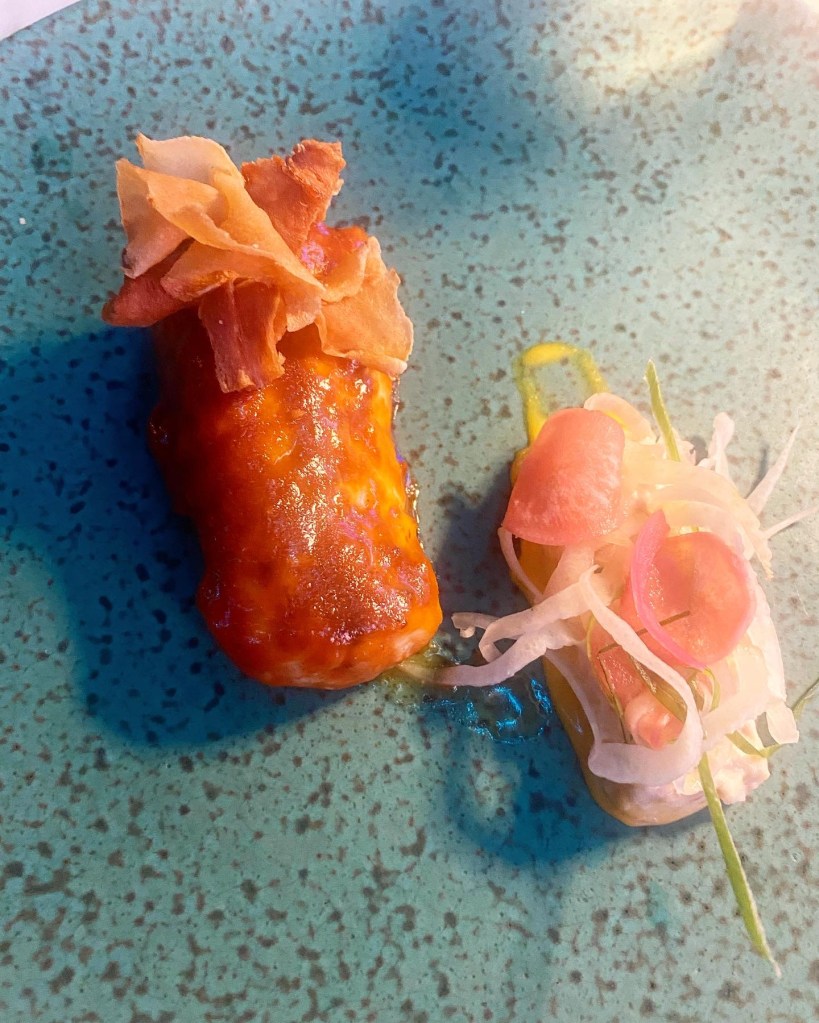 Después, un gran pescado de temporada, el bonito en salazón de polifenoles y aceite escabechado de pimentón con un soberbio y potentísimo helado de anguila ahumada que realza los vinagres del escabeche.