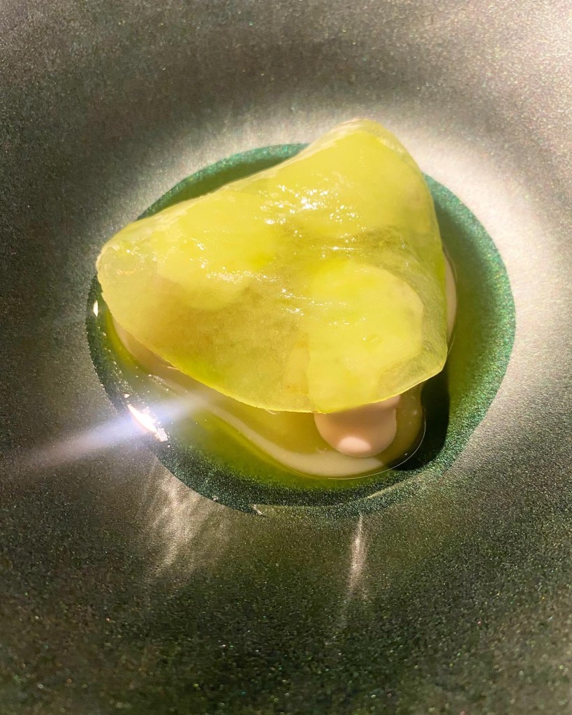 Y a continuación, una de las cumbres de este menú, tanto por técnica, como por creatividad, como por sabor: pepino encurtido, shot helado de ostras, polvo de pepino, royal de ostras y una poderosa y cremosa sopa de maíz que aporta dulzor a tanto sabor recio.