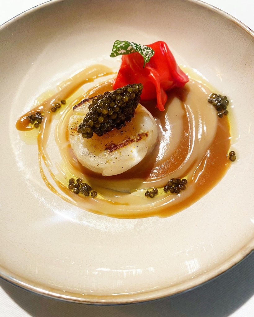 Después, paso a una bodega colosal (por continente y contenido) que es como el árbol primigenio. Allí el estupendo champagne Grand Perrier La Cuvée se empareja con un pizpireto berberecho al albariño y un ceviche diferente y excitante: zamburiña con leche de tigre.