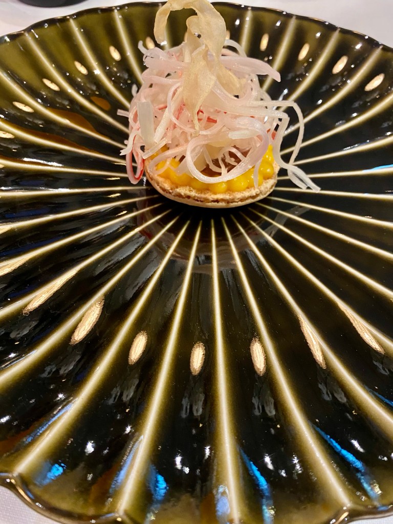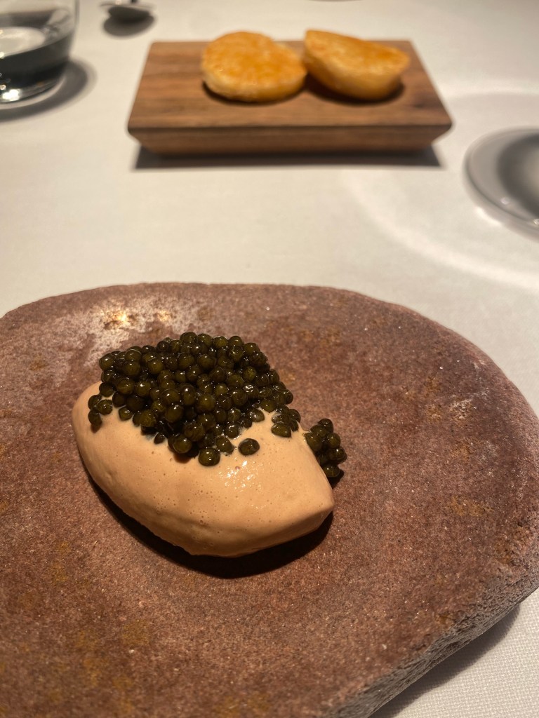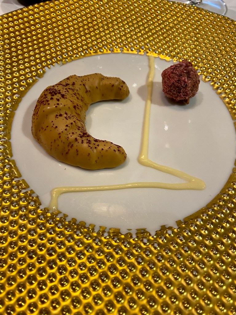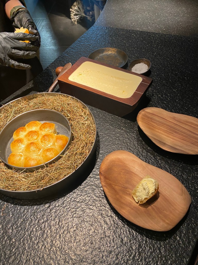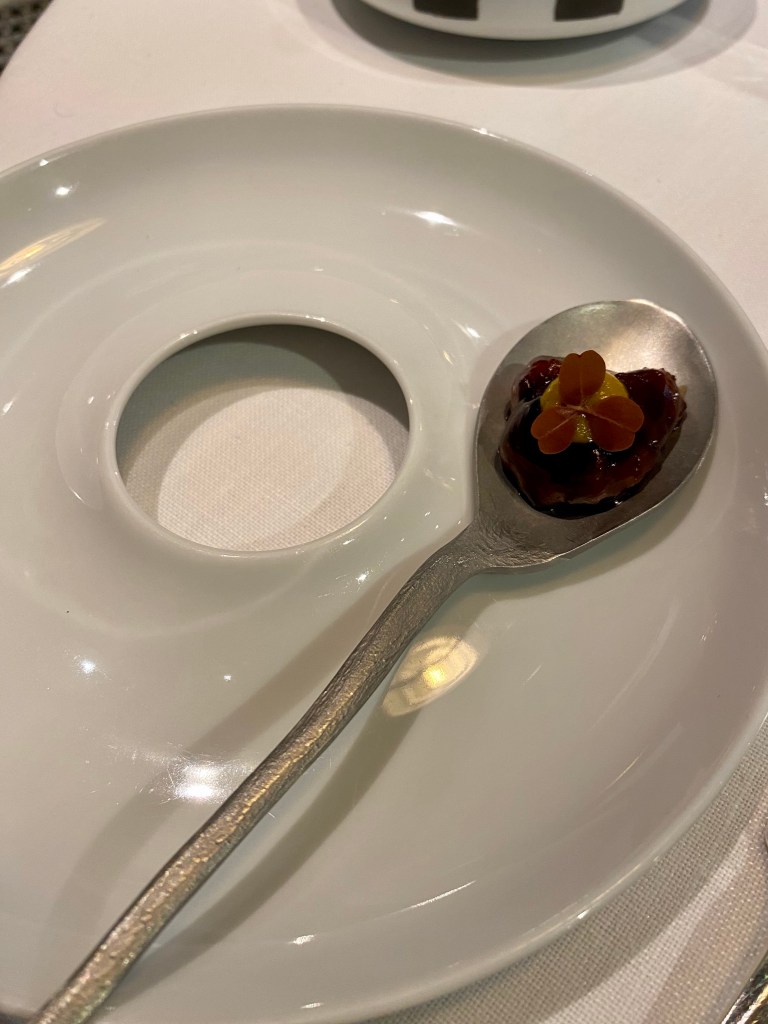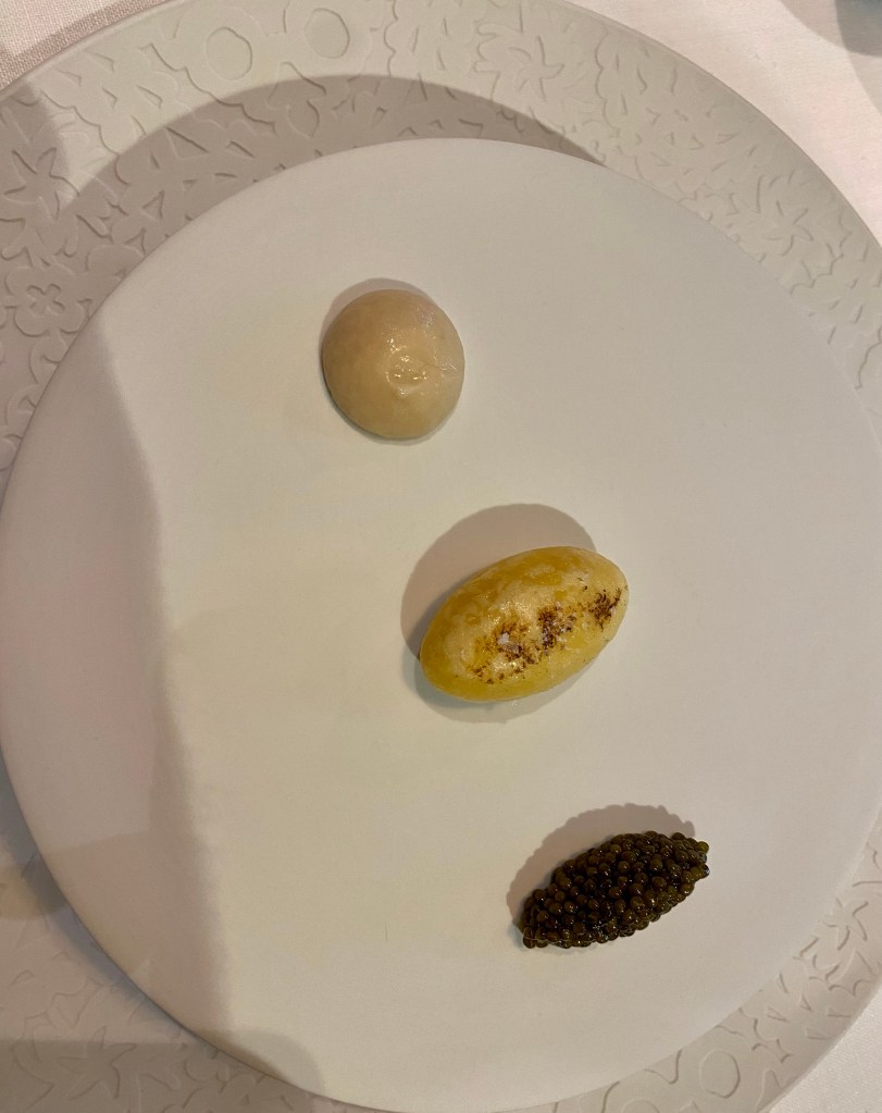 Aparece una sorpresa, cortesía de la casa, que es un maravilloso brioche con caviar Beluga triple 0, de calidad excepcional, embebido en una maravillosa y elegante beurre blanc más líquida y sutil de lo normal. Además, lo sirven con la histórica cubertería dorada de Lhardy y gran ceremonia.