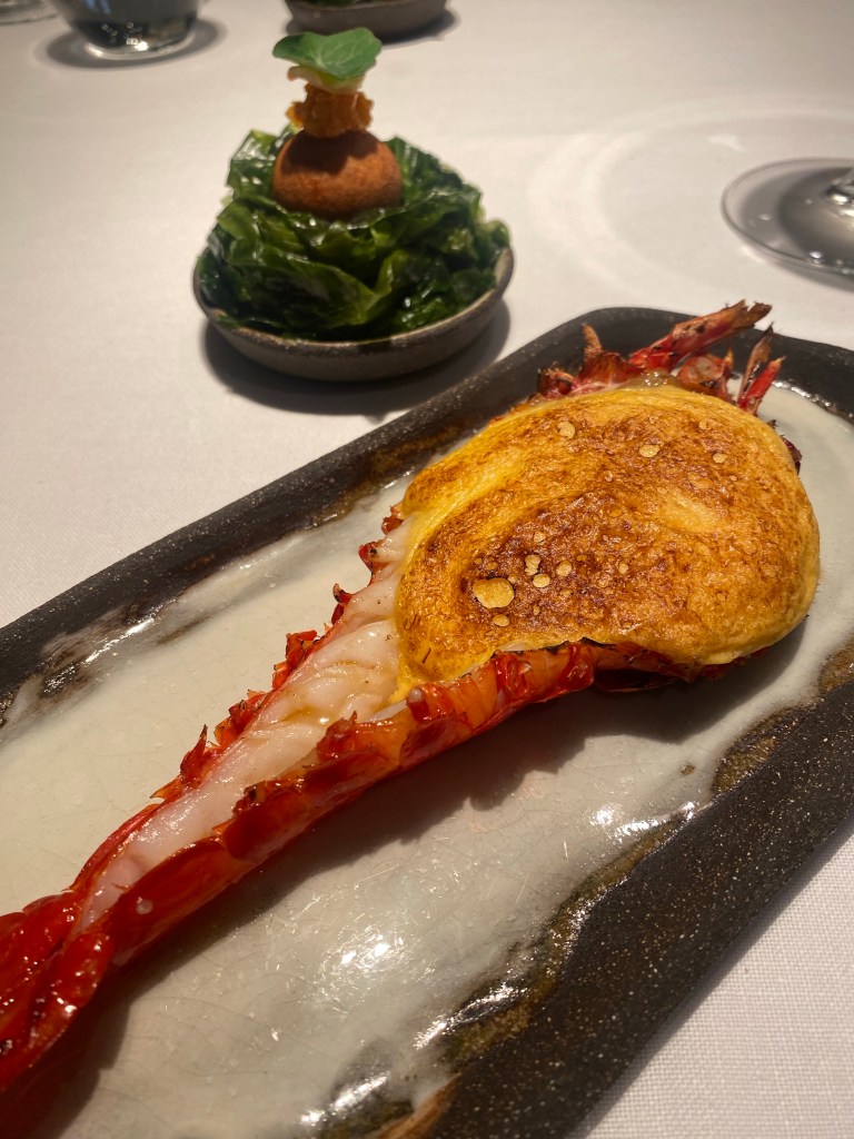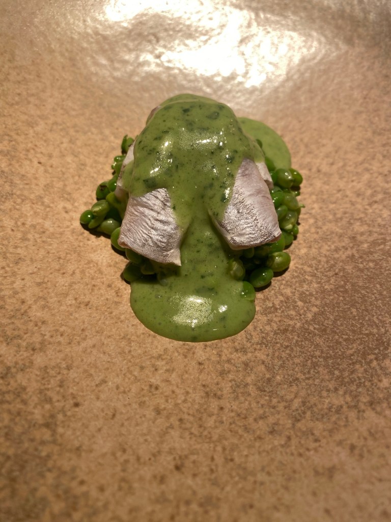 Una sola cigala, de calidad tan excepcional, es difícil de superar pero lo consiguen con unos extraordinarios y diminutos guisantes del Maresme con licuado de acelgas y un delicado toque de mantequilla ahumada. Un plato ligero y sensacional de mar y tierra.