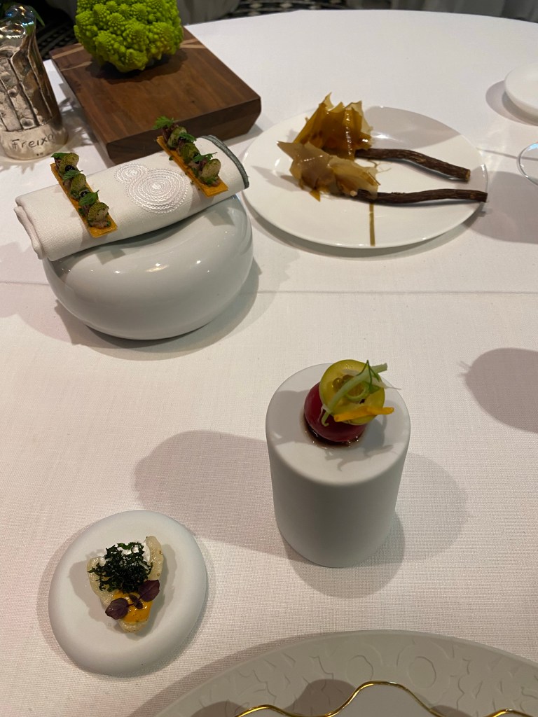 Solo conozco algo parecido en Le Bernardin, pero allí, a pesar del glamour neoyorquino y la exquisita comida, todo es muy francés y más de batalla, mientras que aquí todo es original y sumamente elegante. Cada día cambian los productos y se elige, a precio cerrado, entre tres, cuatro o cinco entradas. Además, pescado del día, la mejor mesa de quesos que imaginarse pueda y unos postres que han mejorado enormemente en los últimos tiempos, tanto en presentación, como en selección y sabor.