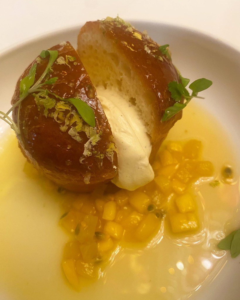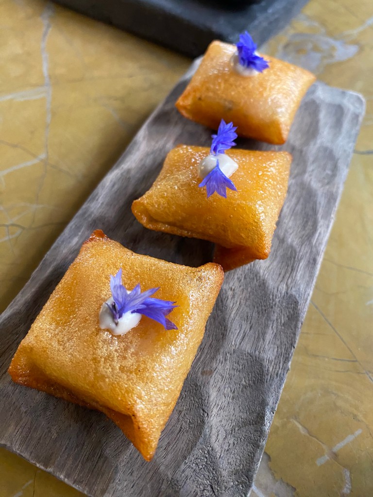 Casi mi plato favorito ha sido la suculenta aleta de esturión, marinada y perfectamente frita, con una crema para mojar que es viili (hongo para fermentar la leche) de leche de oveja con siracha de pimientos verdes, una salsa extraordinaria que cumple (mucho mejor) la función de una mayonesa. La bebida, sin embargo, no me ha ayudado porque eran ésteres oxidados con manzana golden.
