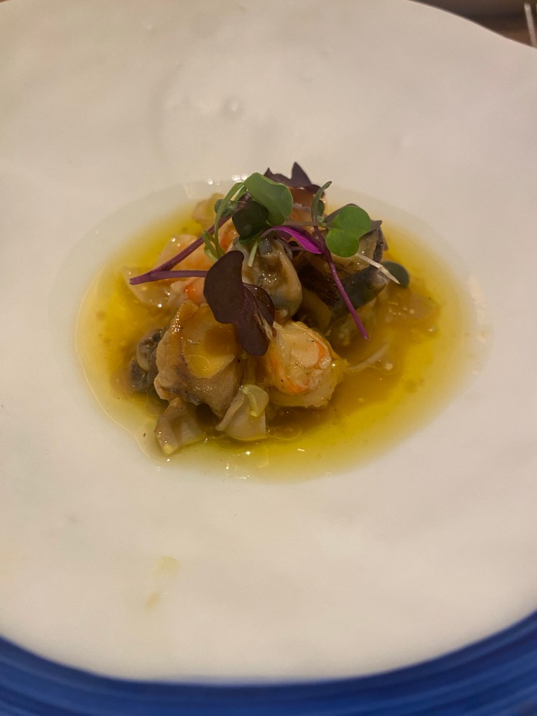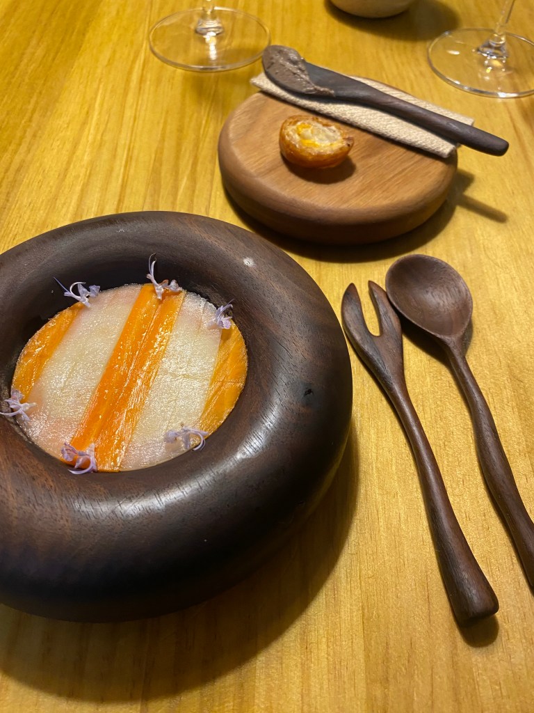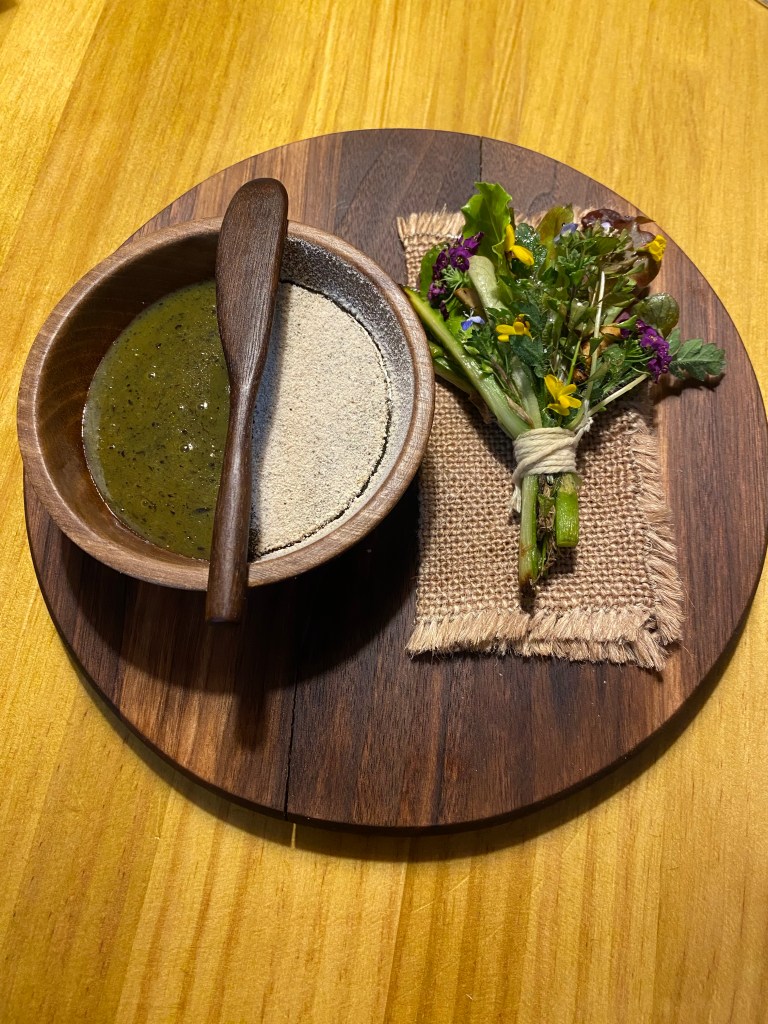 Empieza el juego con una sutil agua de guisantes con cítricos y un ramillete de brotes y hierbas (angula monte, flores, col, capuchina, espárragos y lechuga) que se moja en una crema que es garum de hongos con yema embrionaria, tan fuerte que es felizmente matizado por las verduras. Hay un “maridaje” con bebidas naturales que me han encantado en general, pero no me han gustado mezcladas con la comida. Llevamos milenios honrando y perfeccionado el vino y nada lo supera con una buena comida. Esto se tomaba con fermentando de saúco, una especie de vermú que no estaba mal.