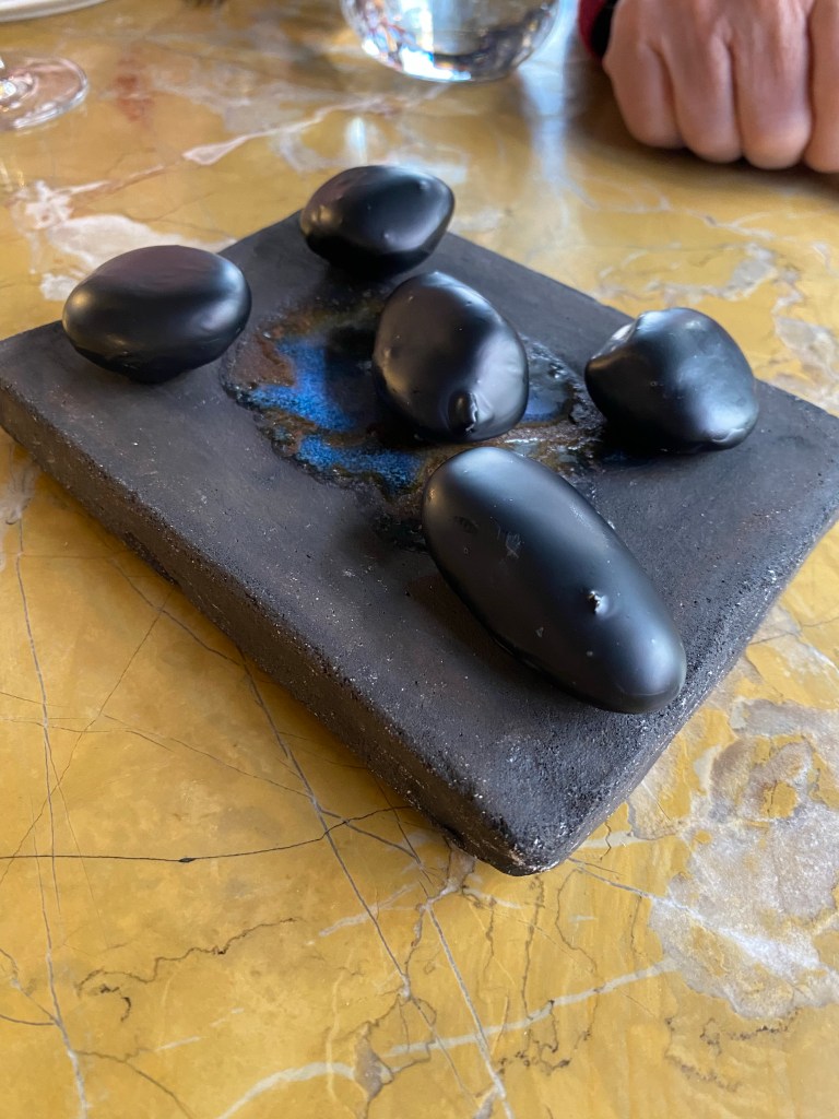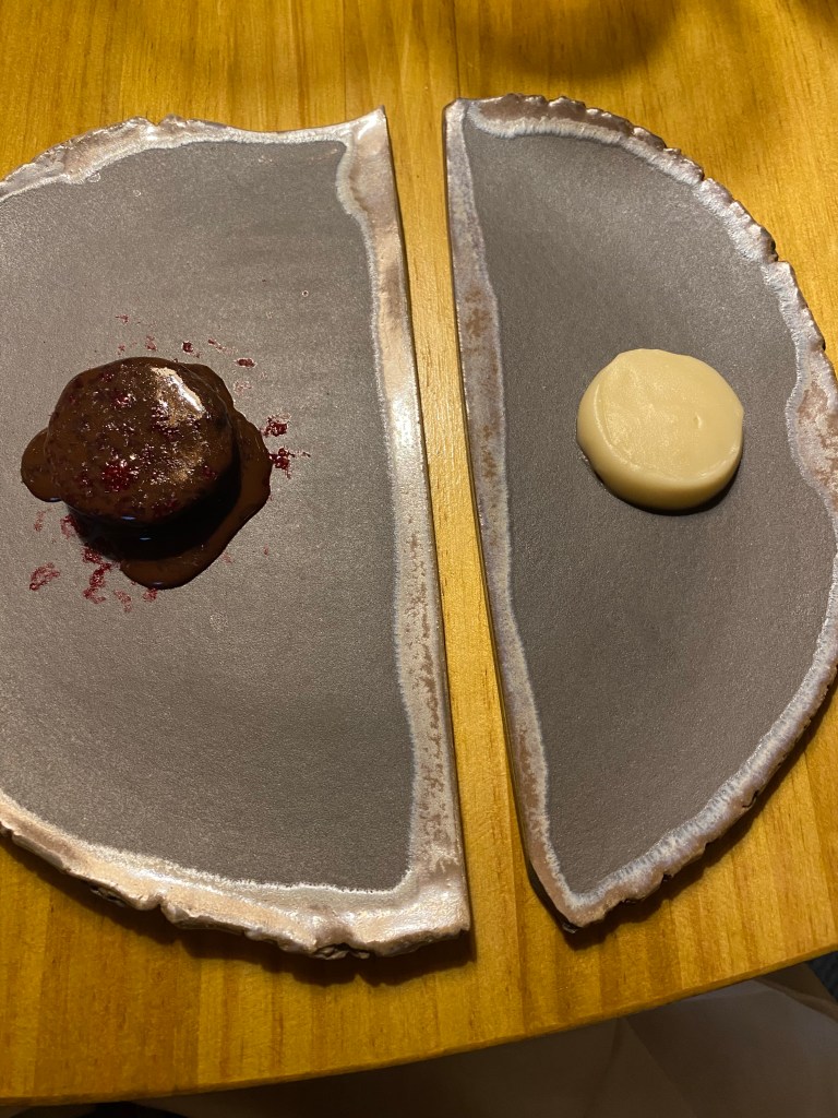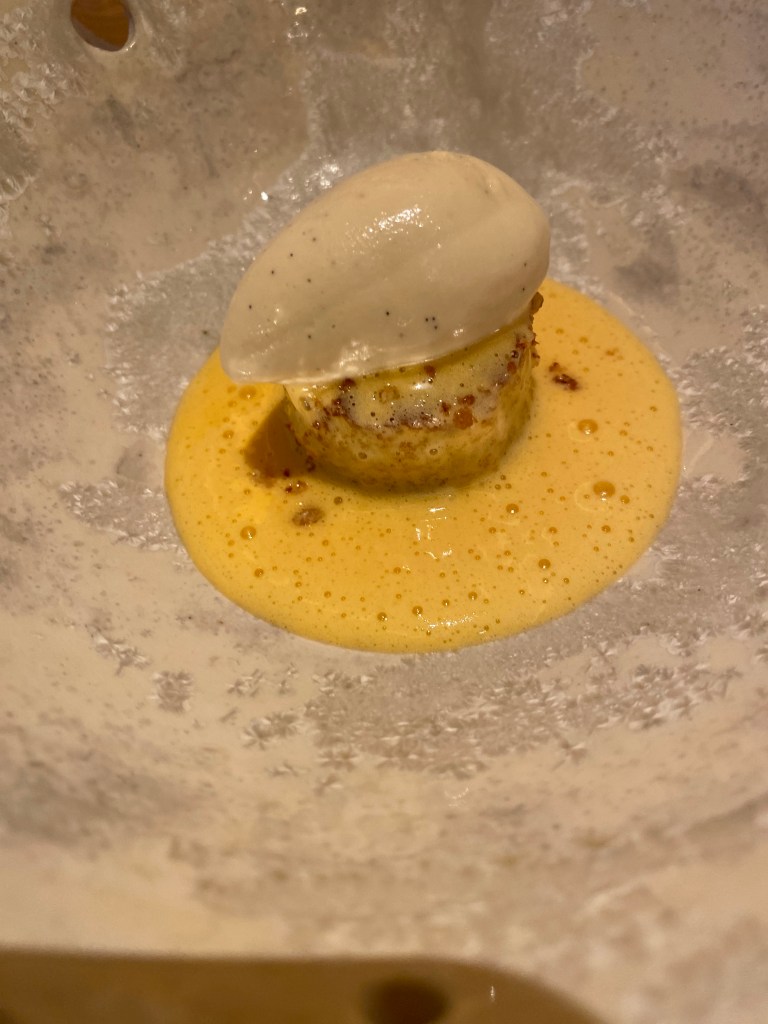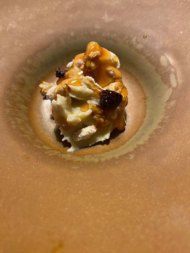 Después de un elegante cambio de servilleta (rústicos pero refinados), una kombucha de pino para acompañar un helado (hecho en heladera antigua) de tupinambo, vino de jerez, brandy y mantequilla tostada. Se mejora con piñones y minipiñas cocinadas en almíbar, vinagre y azúcar. Muy bueno y goloso y lo justo de dulce. Acompañando un gran PX de más de 70 años en barricas de Montilla Moriles. Qué diferencia.
