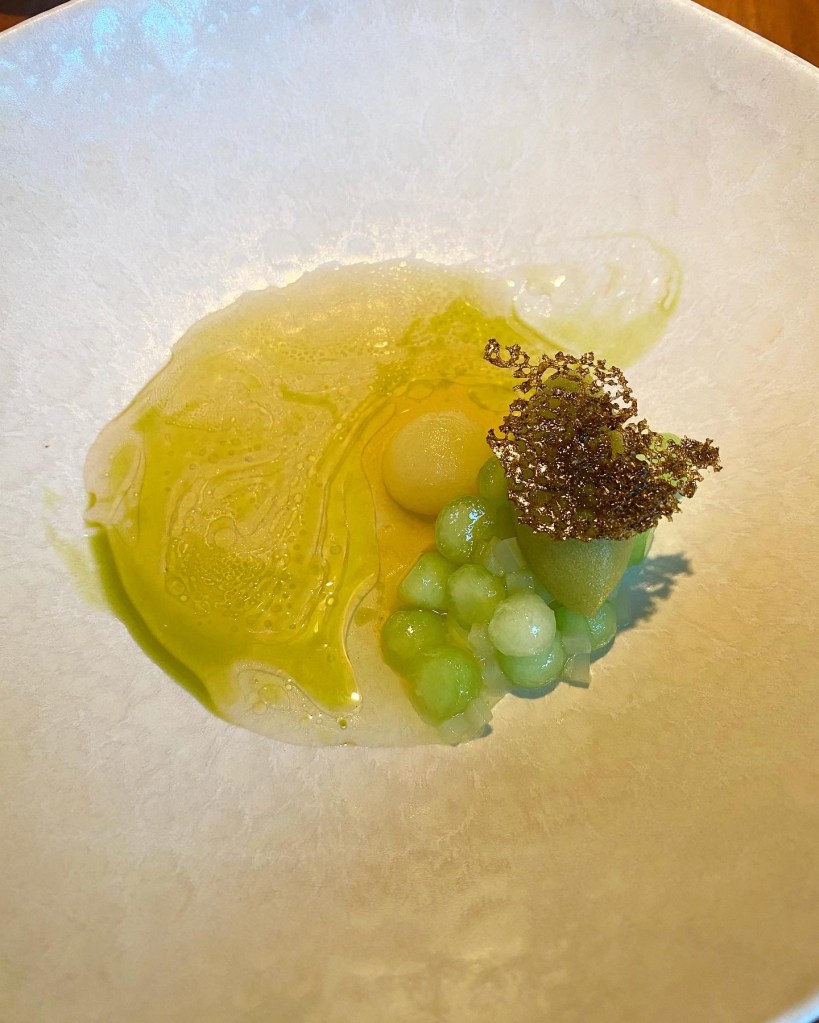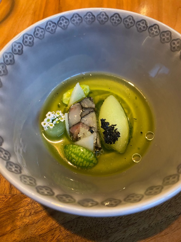 Siempre vengo en verano a por su estudio del tomate. En este del 23 ofrece dos pases: una rodaja de tomate rosa enfrentada (con orégano, helado shot de tomate, alcachofas…) que es sabor delicado y ensalada delux y una potente y arrebatadora ventresca de atún con envuelto vegetal y dados de sandía, huevas de mújol y un estupendo y aromático jugo de tomate rosa. Una receta de atún muy difícil de mejorar.
