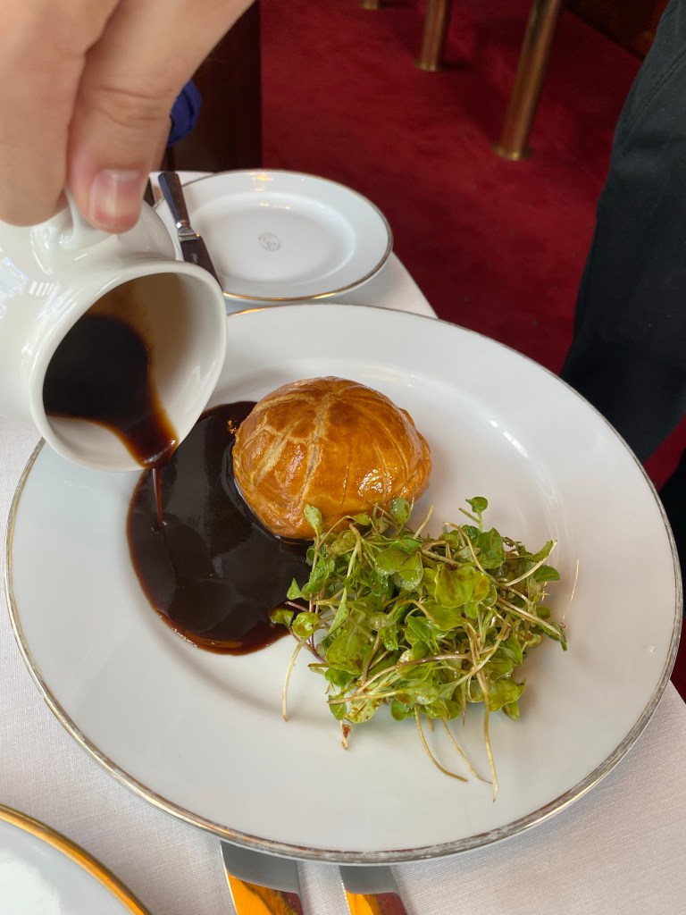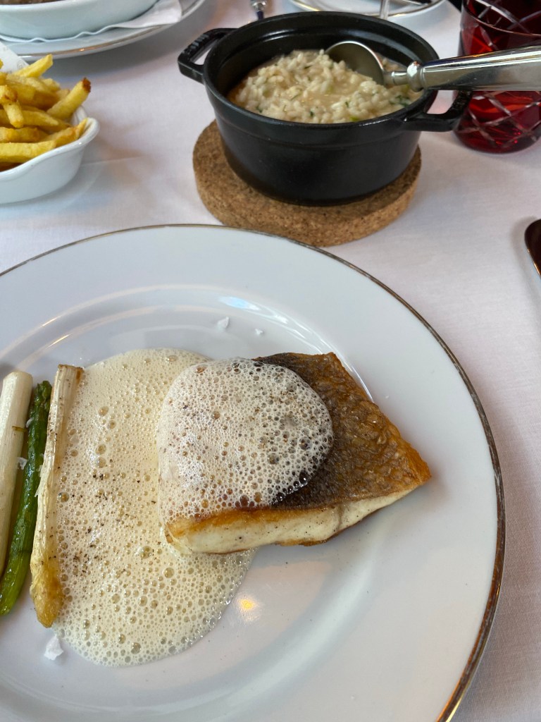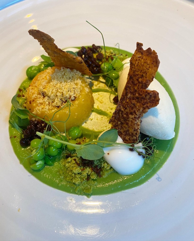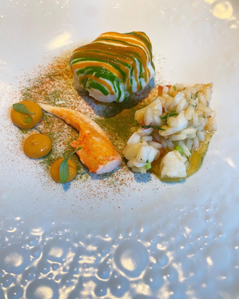 Siempre se luce Ramón en los pescados y así lo hace con un excelente mero con una soberbia salsa que es su pilpil con pieles en texturas y una envolvente salsa de cava que recuerda aquella maravilla de la lubina al champagne. En platos aparte (otra seña de la identidad ramoniana y herencia Gagnaire) un goloso ravioli que es carpaccio de carabinero con micro verduras y una nécora que es changurro viajero (por sus sabores de aquí y allá) con espuma de yuzu y manzana. Tres platos en uno, siendo cualquiera de ellos, verdaderamente único.