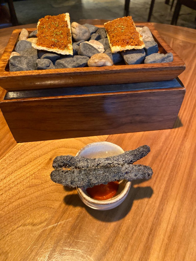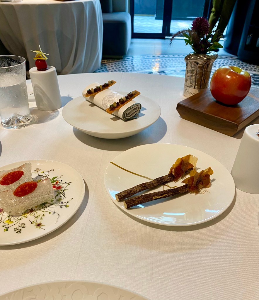Los chocolates del chef son de lo mejor de su cocina y son aromática esfera con flor de saúco, Tainori 64% con lavanda y Caramelia con tomillo y limón y sorbete de Abinao 85% con mucho romero. Para presumir aún más, cremoso de estragón y, al final, un postre bonito e infalible.