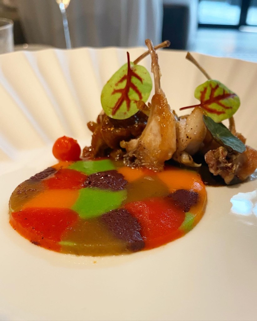 El daliniano es un plato culto y con “relato”, inspirado en un banquete desaforado del pintor que asume el riesgo de los ingredientes despreciados por difíciles: junto a un bello mosaico vegetal, un rico guiso con caracoles, ancas de rana y chuletillas de conejo. Muy bueno y aún más rico por lo infrecuente.
