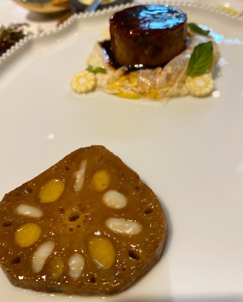 También me encanta el lineal de patata con butifarra del perol y alubias de ganxet, todo un guiso en un mini bocado. El palulu con boletus y foie dice que es pura infancia y será por el delicioso palito, porque es demasiado elegante y sabroso para simples niños.