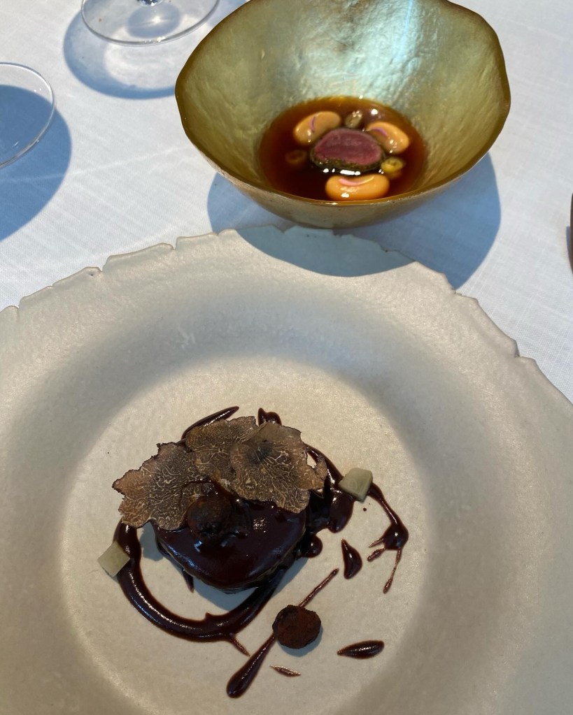 Hay un gran plato de trufa que mezcla un canónica y elegante crema de trufa, generosa en nata con un llamado “plant print”, una lámina hecha de almidón impreso con multitud ze plantas que se mezcla con el caldo. un plato tremendamente sabroso, y aún más interesante, en el que lo más clásico y lo más atrevido se dan la mano.