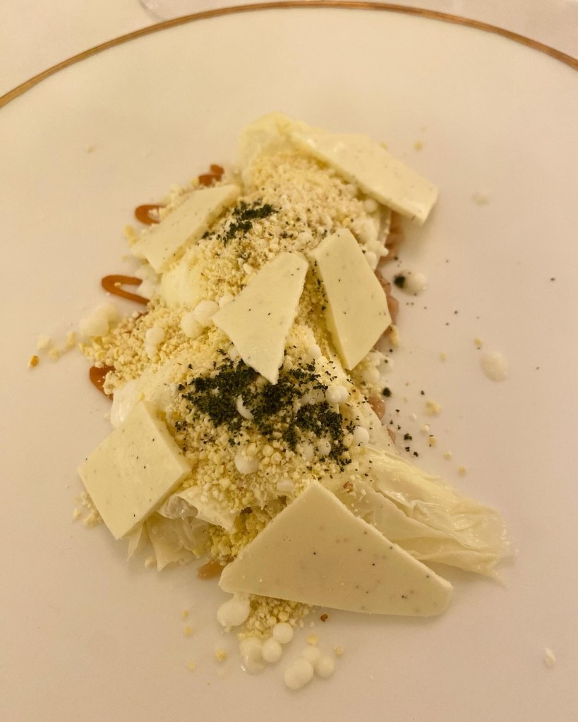 Me ha encantado para hacer la transición al dulce, un elaborado queso: fragilísima y crujientísima tartaleta (2022) de un muy cremoso brie, cubierta de trufa.