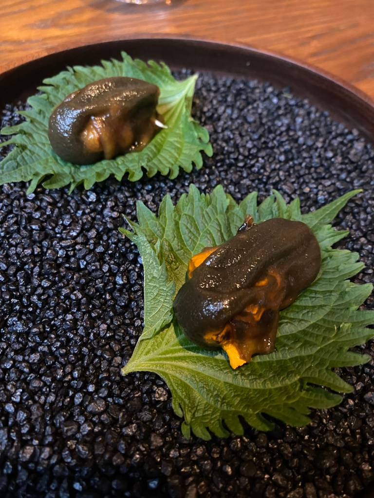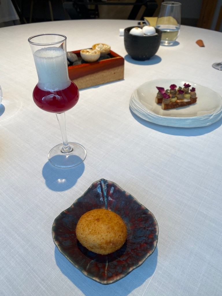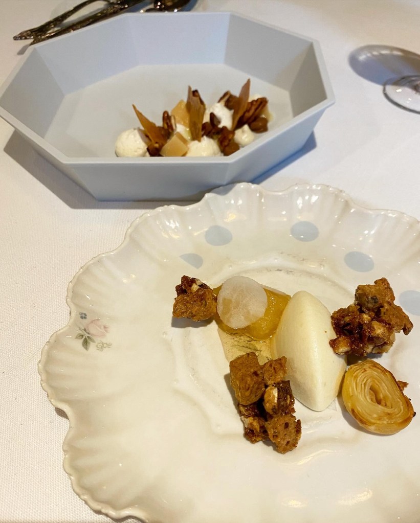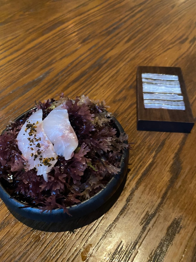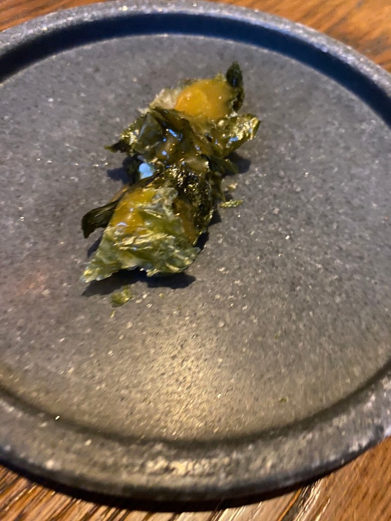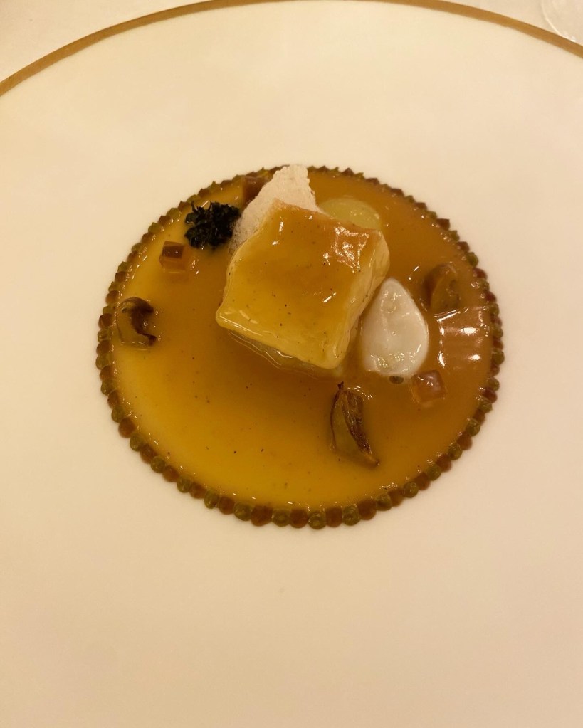 Pero es mejor que vean todo esto a través de su cocina, empezando por cuatro grandes aperitivos: una nada marina -pero dulce y deliciosa-, y muy crujiente tartaleta de calabaza y naranja (helada) acompañada de un sutil pisco sour de calabaza y naranja (2022); un muy marino y sabroso sándwich de melba (que es también potente crujiente de alga nori), con punzante mayonesa de wasabi (2017) y un soberbio “recuerdo de Galicia” (2018), un mosaico de estofado de pulpo con patata y pimentón. Como un pulpo a la gallega, pero en mejor aún.