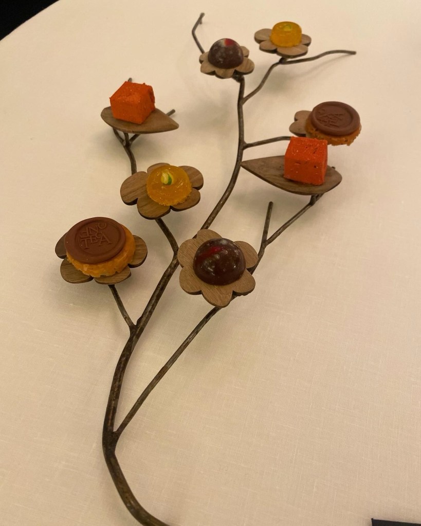 Todo es rico y muy bonito y nunca decae porque la presentación de las mignardises es de una delicadeza incomparable, una suerte de dulce rama de cerezo en flor.