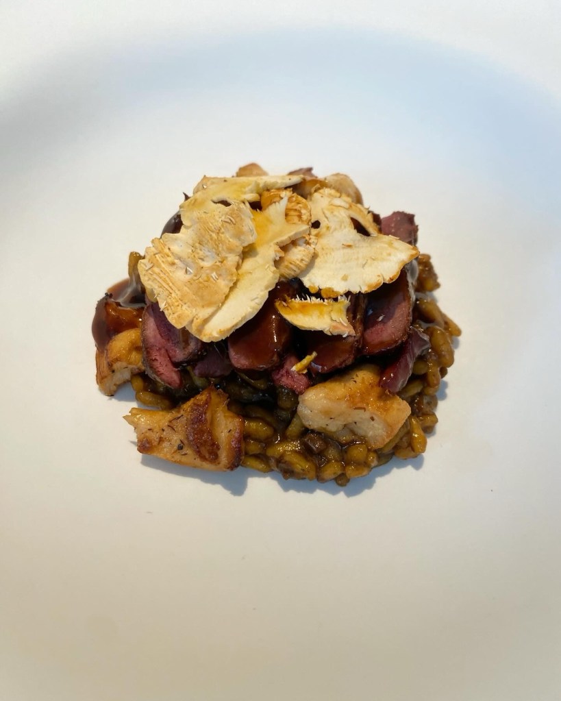 Creo que vamos subiendo, porque me ha encantado el arroz de setas y pato azulón hecho con un estupendo caldo de setas y demiglas. Sobre él la pechuga de pato, levemente crujiente, y lengua de vaca (la seta del caldo) laminada. Un súper arroz.