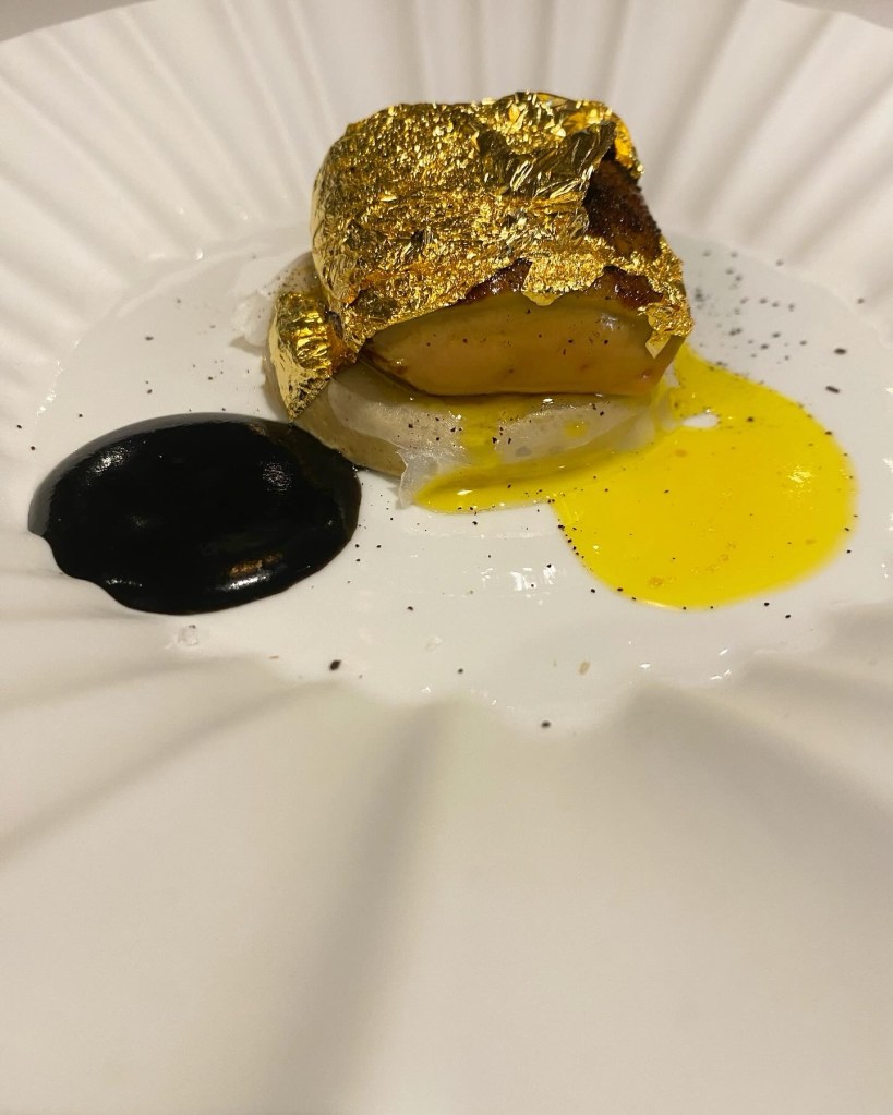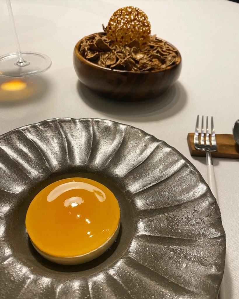 En un precioso recipiente, llega el flan salado con consomé ibérico a la Manzanilla, girgola de Castanyer a la brasa, foie y el delicioso sabor de la anguila ahumada. Un conjunto soberbio.