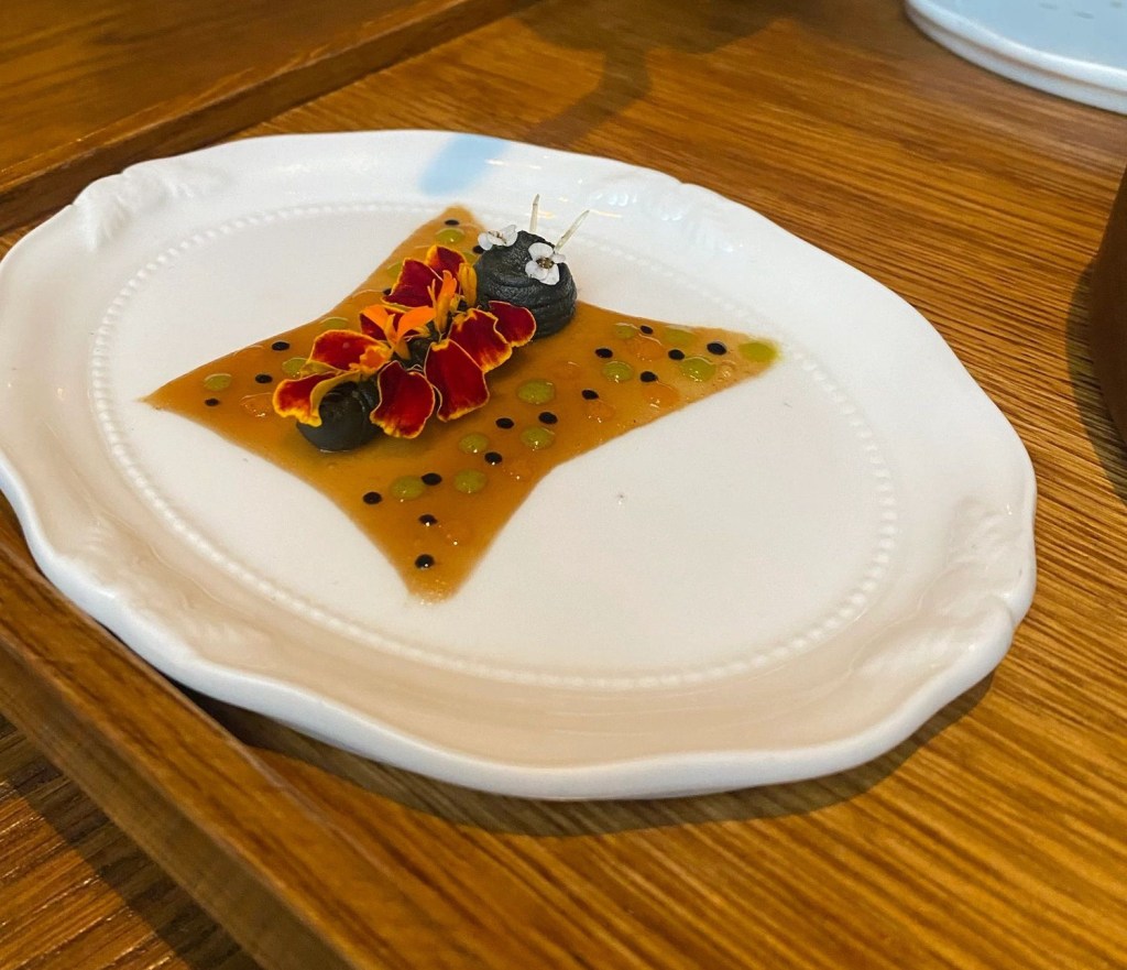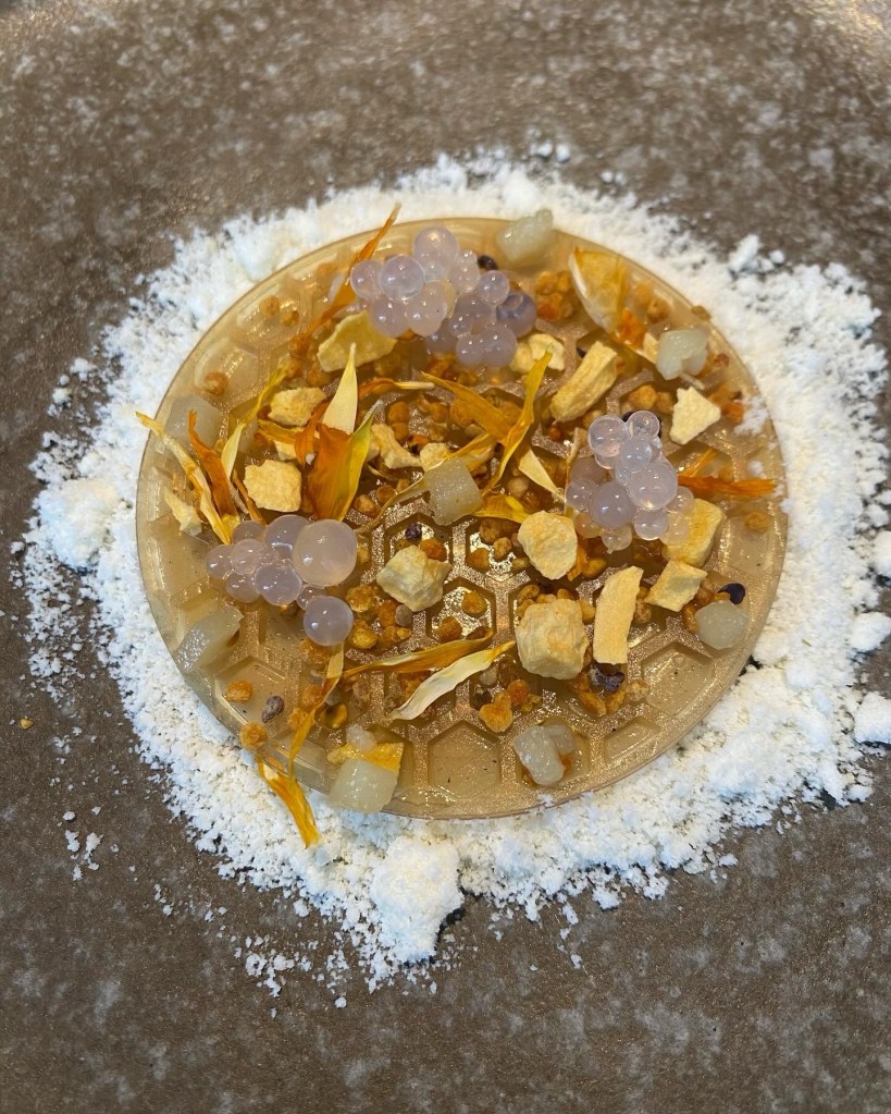 Queda aún, estamos dispuestos, “mancheguidad” absoluta de queso, miel y romero que es cuajada en el kamado para tener toques ahumados, un panal de miel con esferas de limón, maracuyá y flor de caléndula, con al añadido del frescor de un polvo helado de queso al romero. Dos grandes postres de pocos ingrediente, pero hechos, como si fueran palabras, en todas sus declinaciones/preparaciones.
