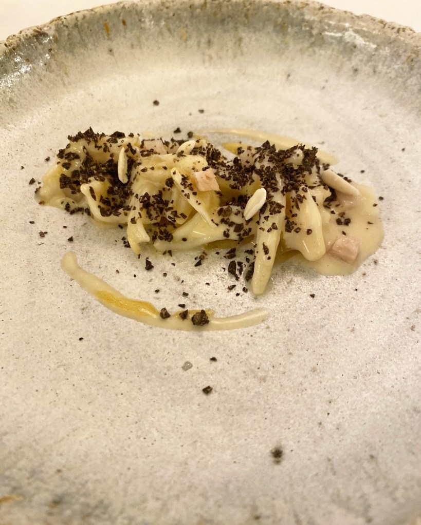 Los guisantes del Maresme son suntuosos, crujientes y apenas hechos y se animan con callos de bacalao, de estupenda textura, aromática trufa y una “no” carbonara de panceta.