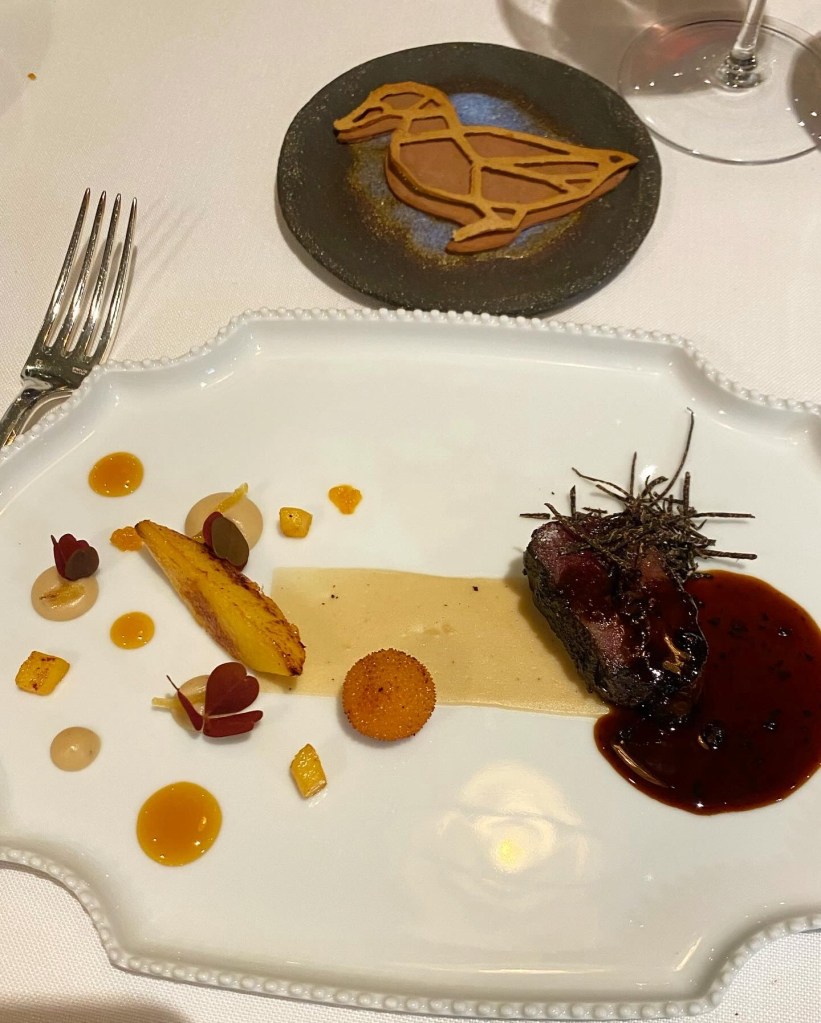 Hay una carne, pichón (2021) de perfecto punto bien madurado, una profunda demiglas y los toques maestros e históricos (la salsa preferida de los romanos y que salía a espuertas se Hispania) de un garum de pichón y otro de portobello.