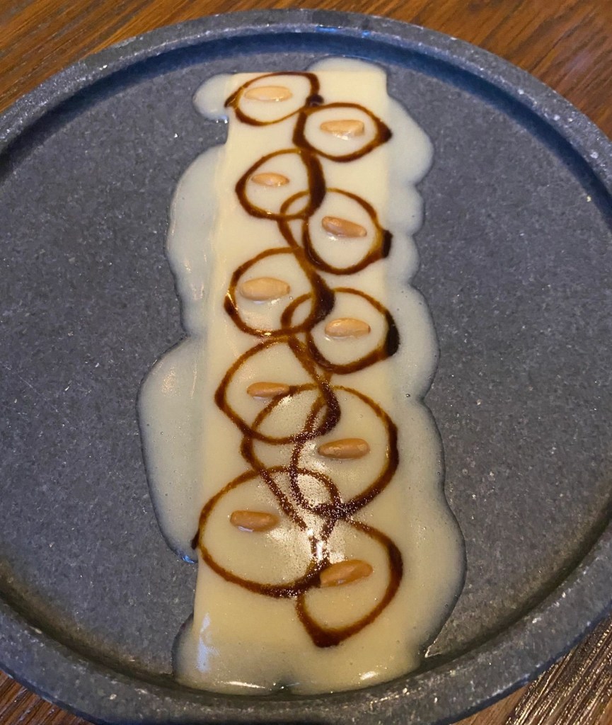 Tradición de 2020, es un magnífico arroz -en los que Paco es reputado especialista- cremoso con caldo de gallina, caviar de piñones (nitrógeno), otros al natural y deliciosa trufa, un plato en el que se ve poco porque todo está en el sabor del caldo que embebe el arroz.